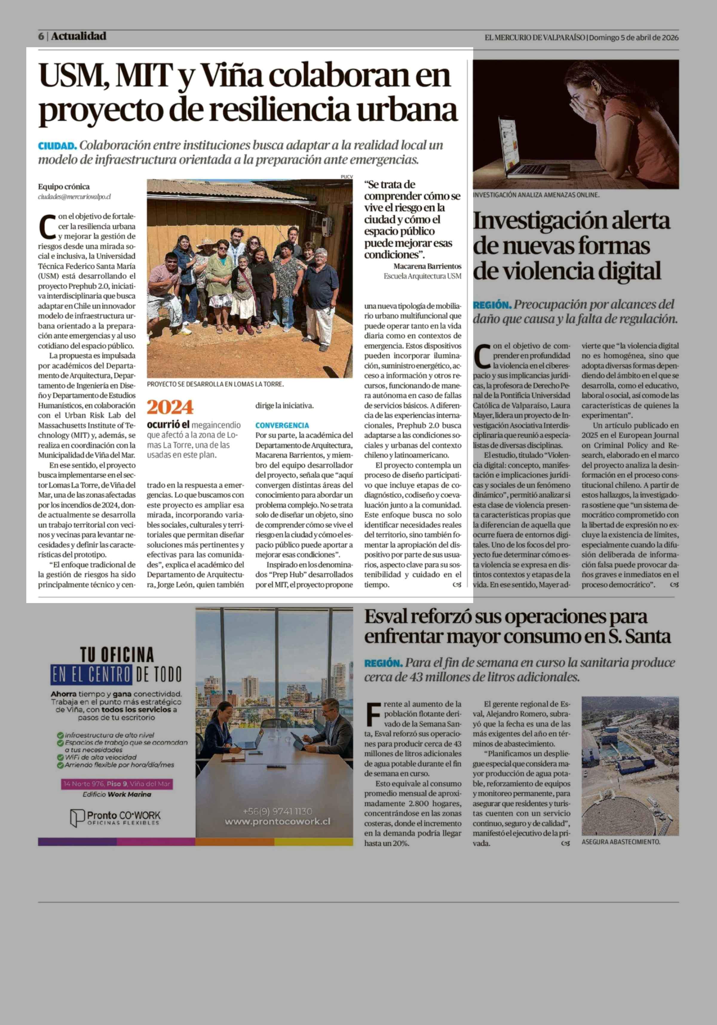 USM, MIT y Viña colaboran en proyecto de resiliencia urbana 05-04-2026 El Mercurio de Valparaíso |