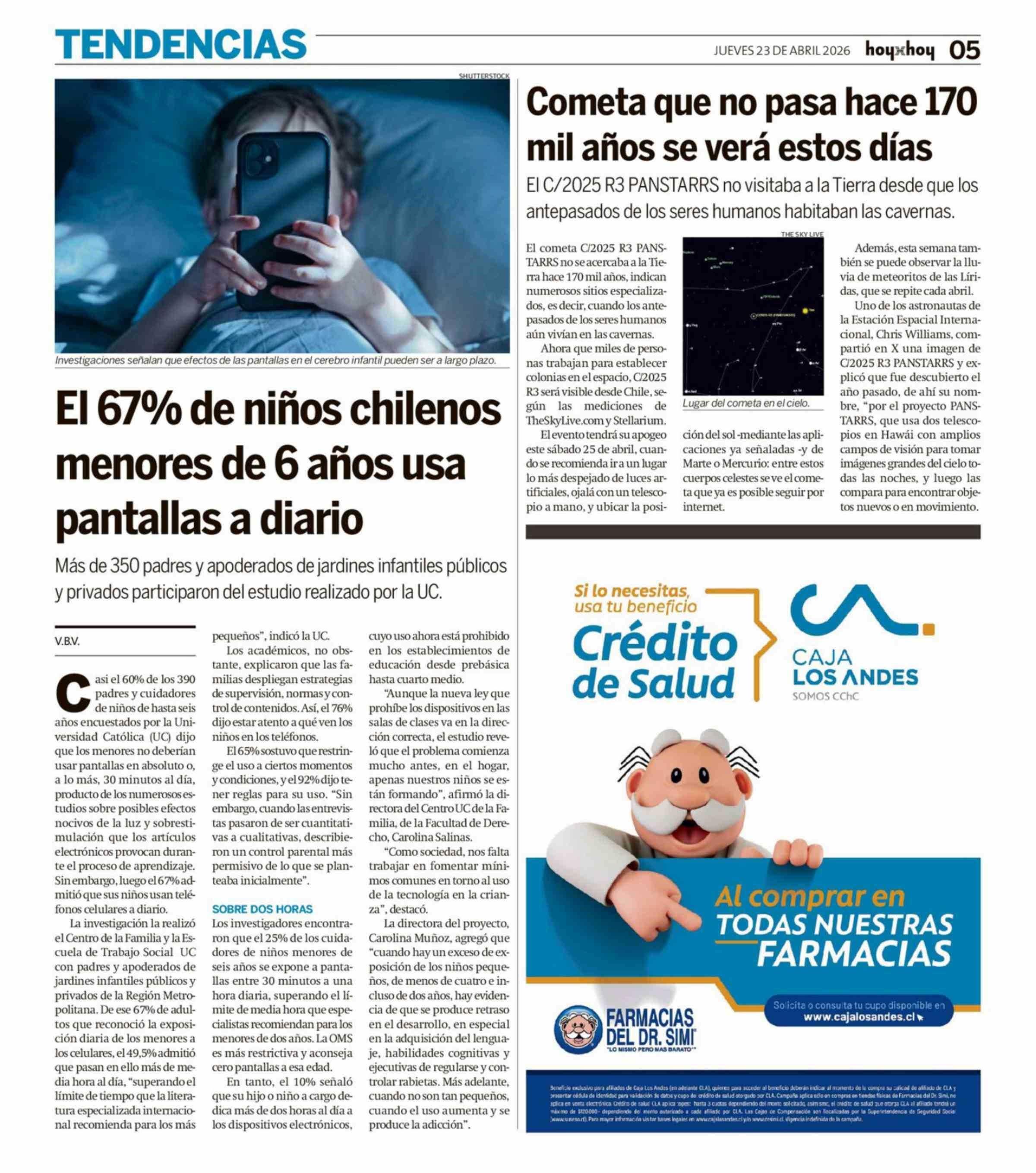 El 67% de niños chilenos menores de 6 años usa pantallas a diario 23-04-2026 Hoy x Hoy |