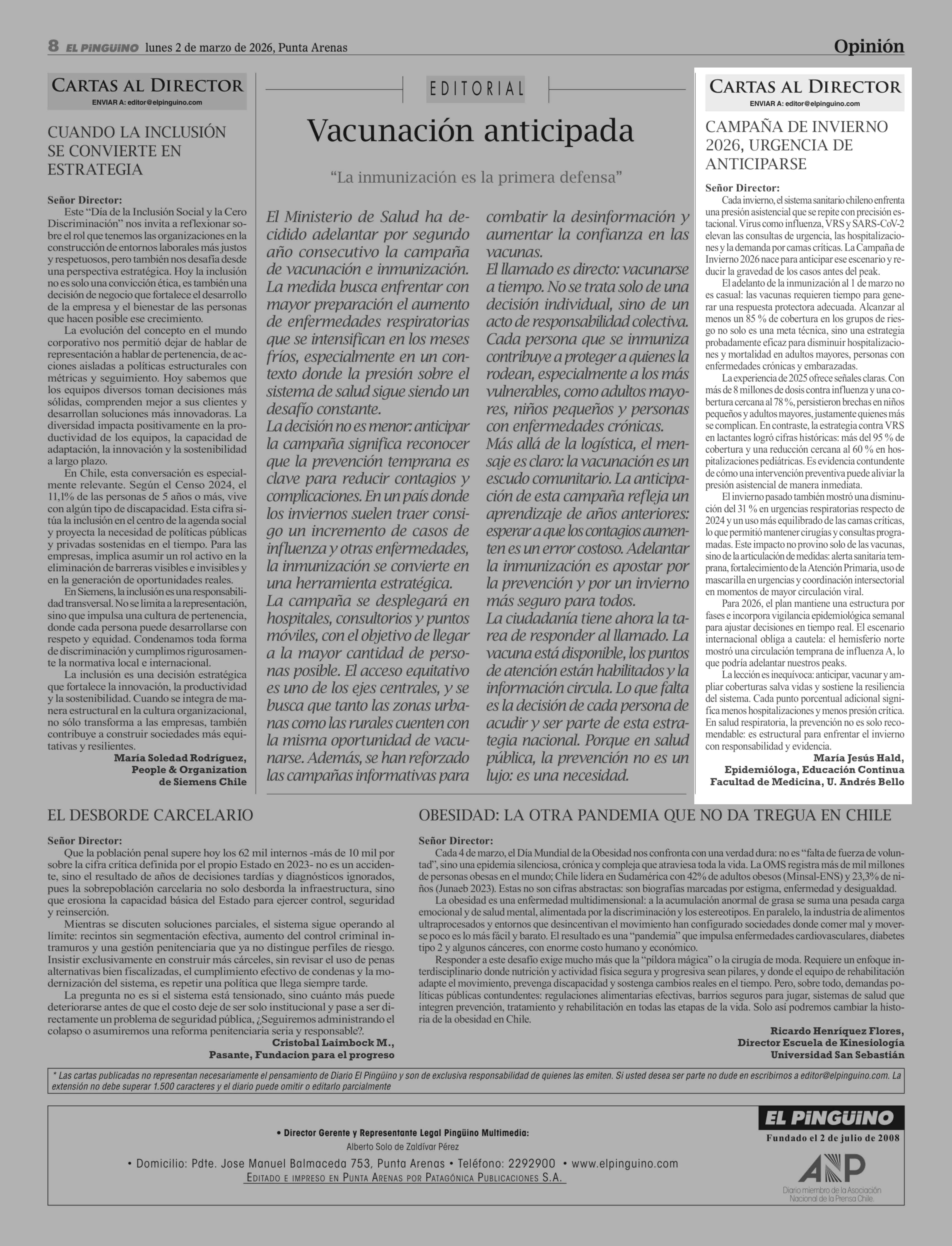 Cartas: CAMPAÑA DE INVIERNO 2026, URGENCIA DE ANTICIPARSE
