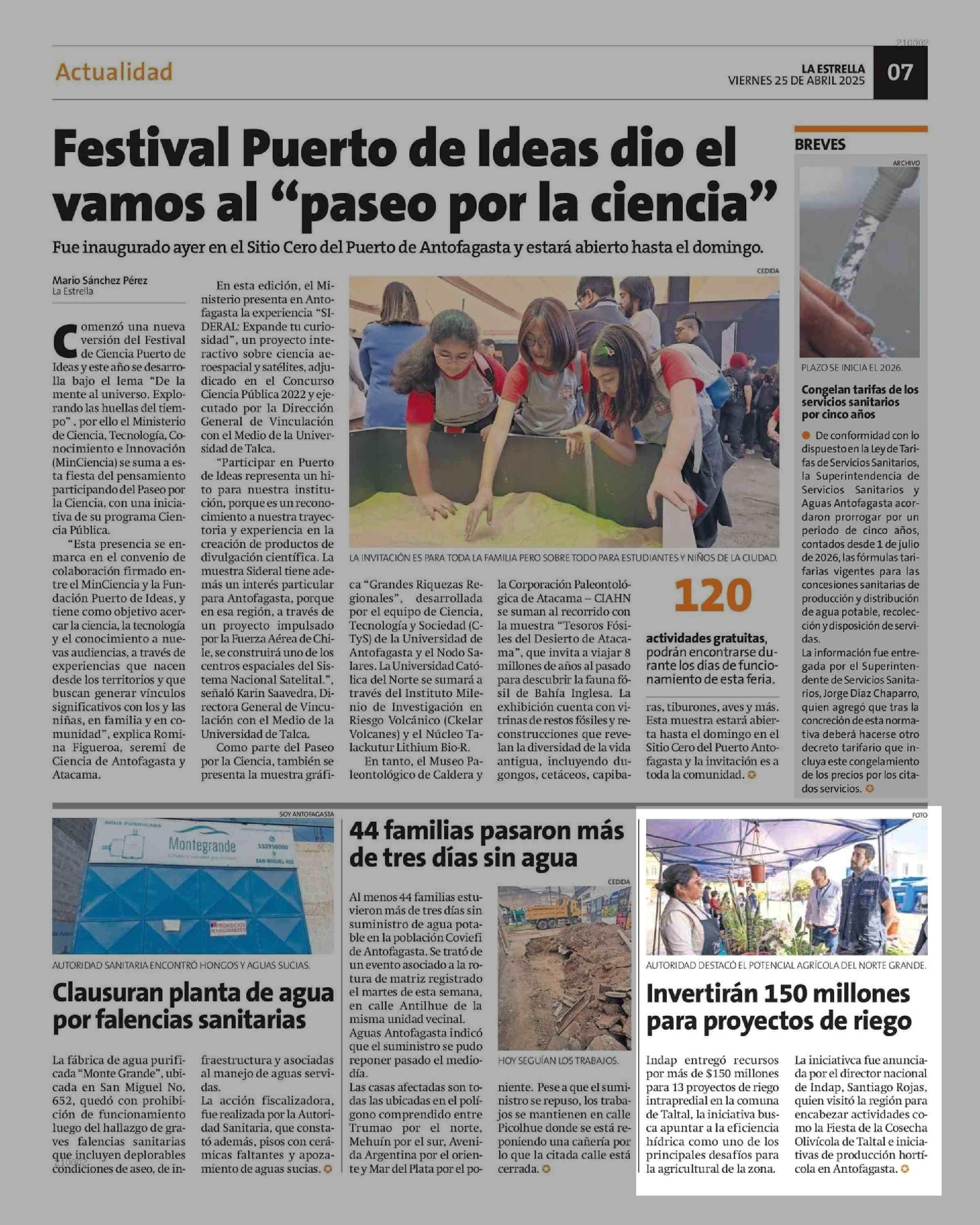 Invertirán 150 millones para proyectos de riego 25-04-2025 La Estrella de Antofagasta |
