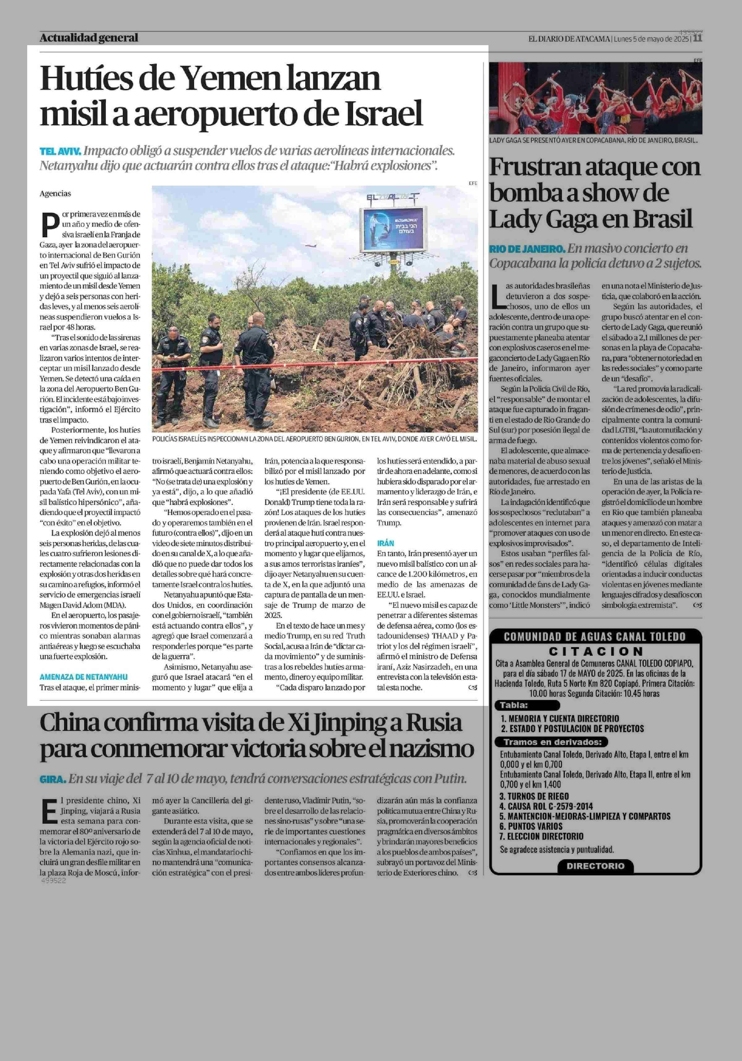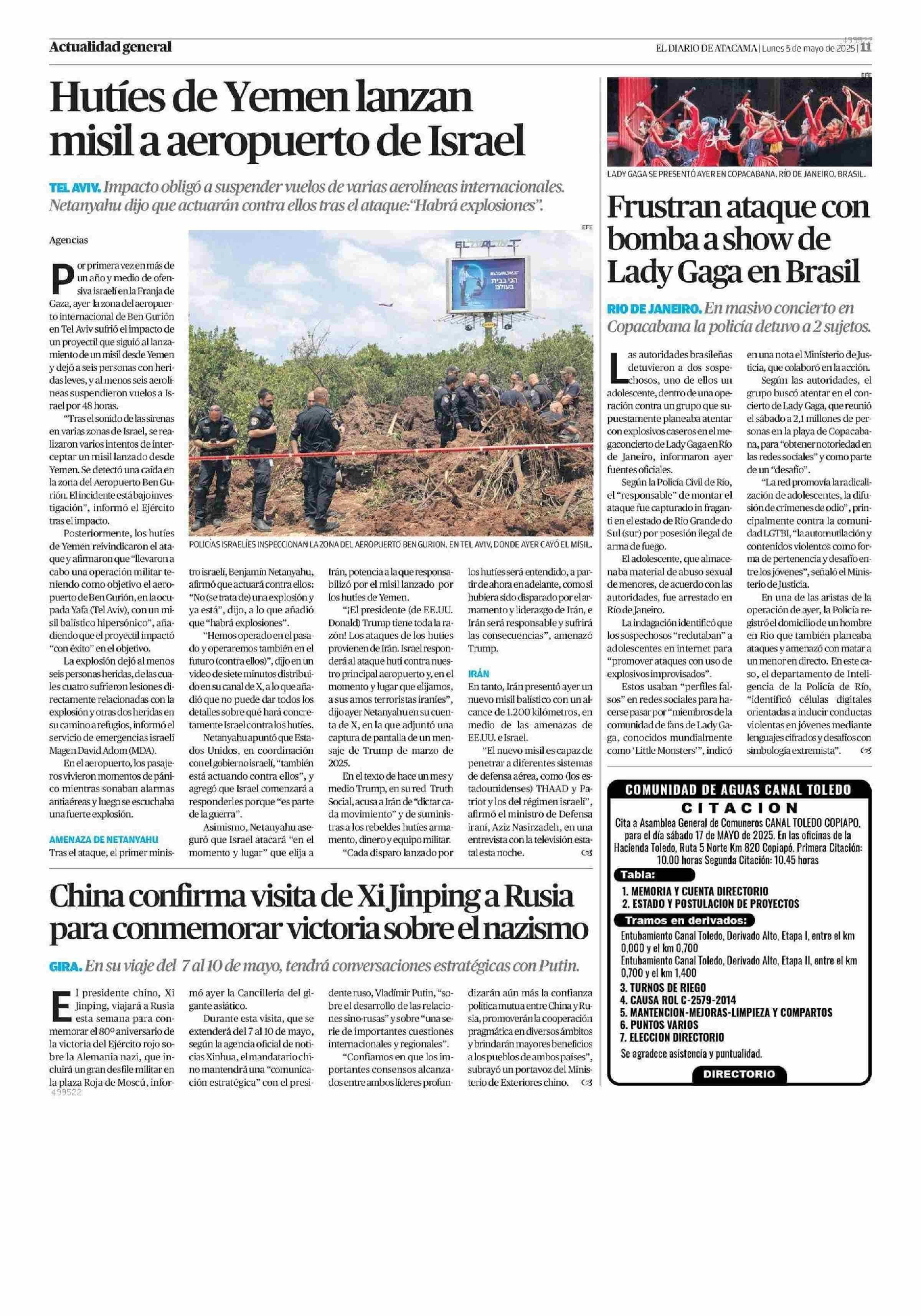 Hutíes de Yemen lanzan misil a aeropuerto de Israel 05-05-2025 El Diario de Atacama |