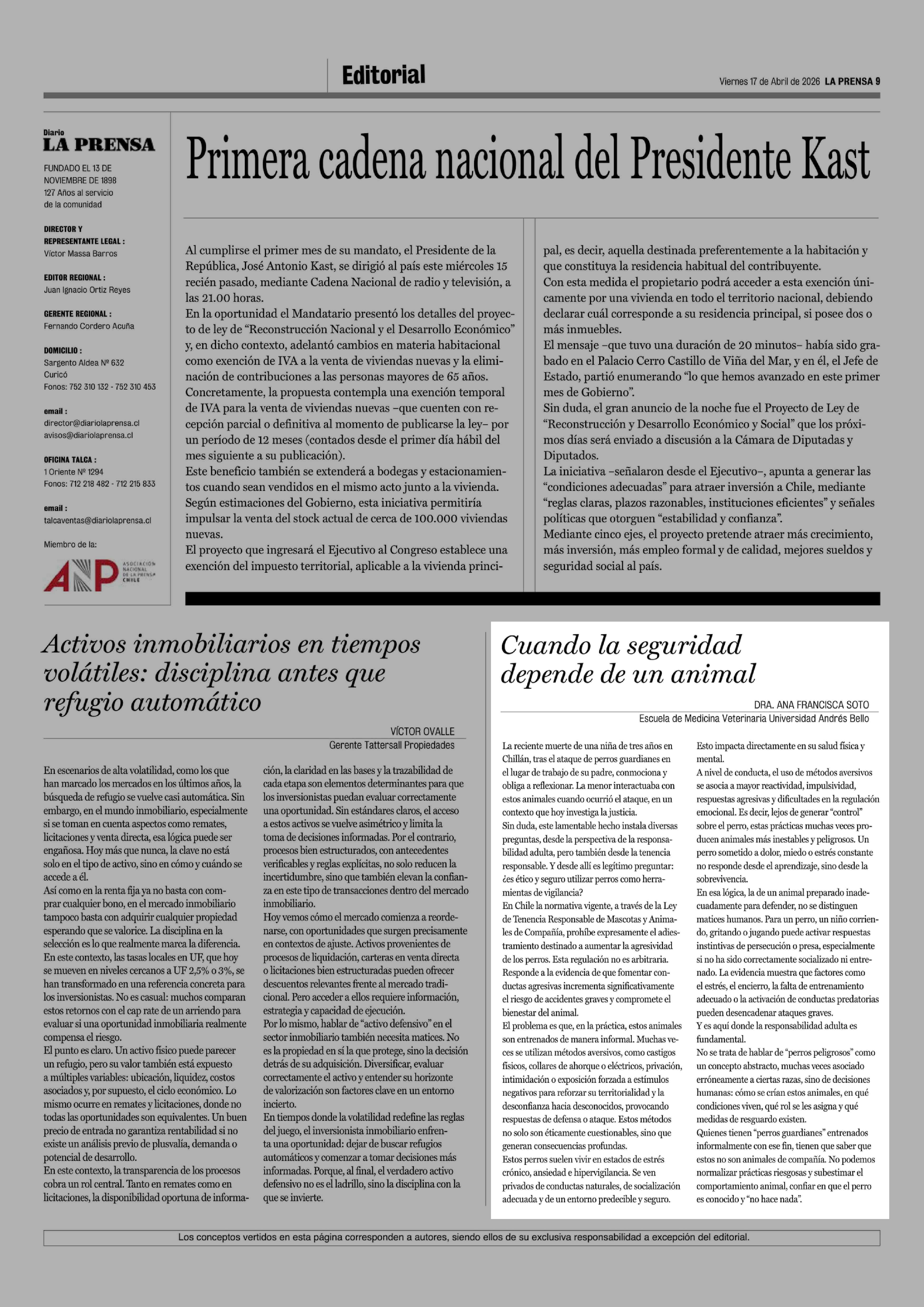Cartas: Cuando la seguridad depende de un animal 17-04-2026 La Prensa de Curicó |