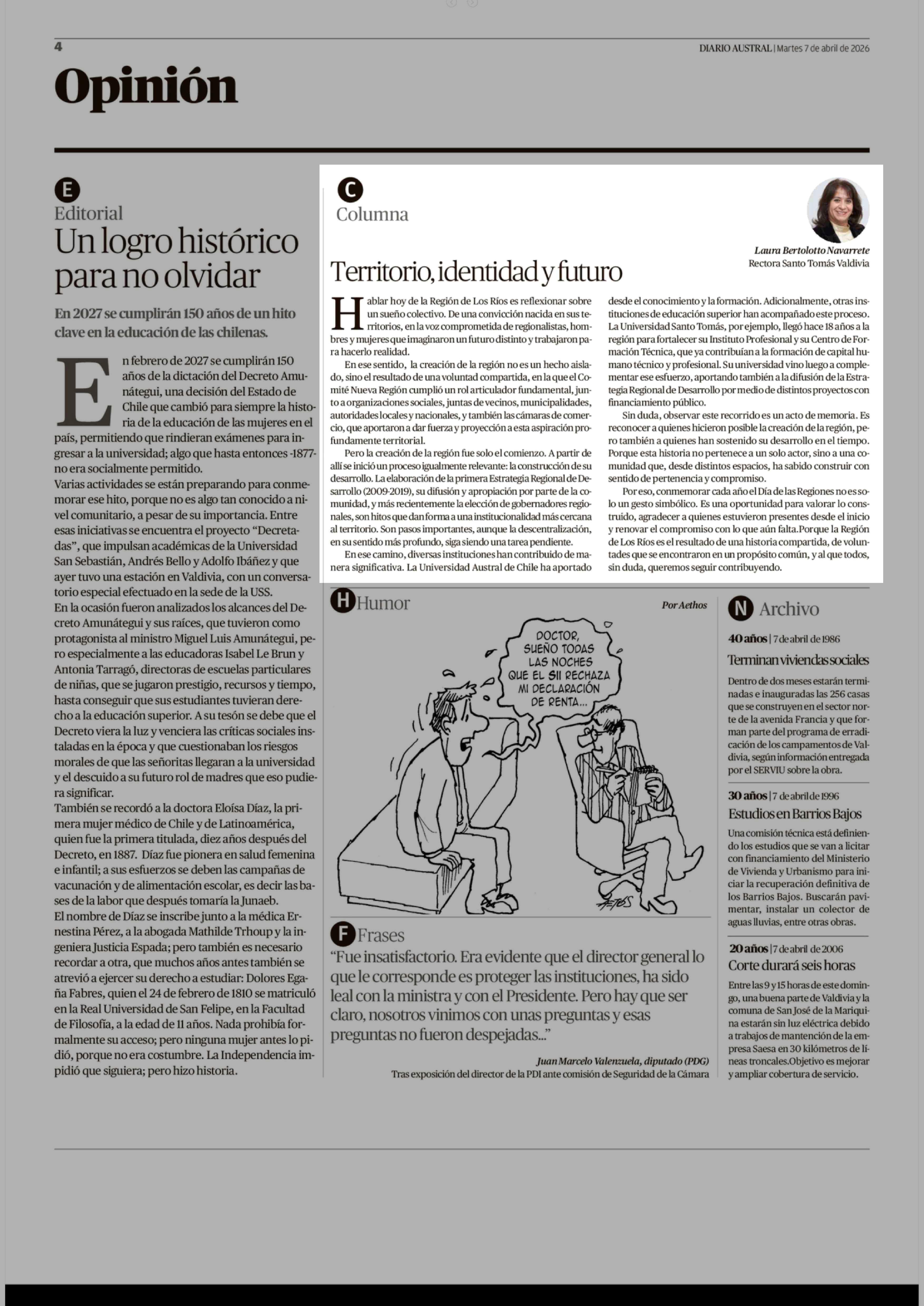 Columnas de Opinión: Territorio, identidad y futuro 07-04-2026 Diario Austral Región de Los Ríos |