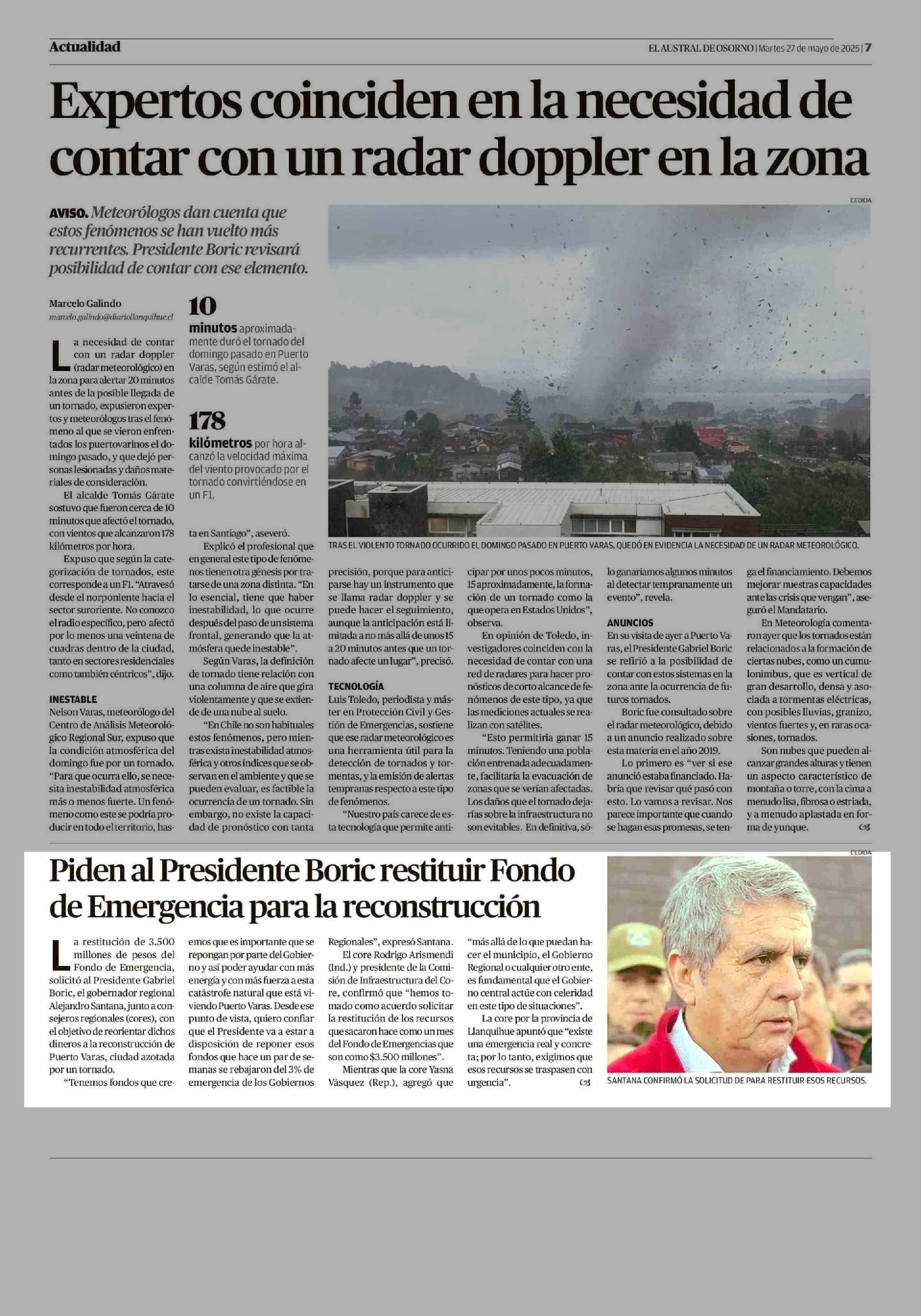 Piden al Presidente Boric restituir Fondo de Emergencia para la reconstrucción 27-05-2025 El Austral de Osorno |
