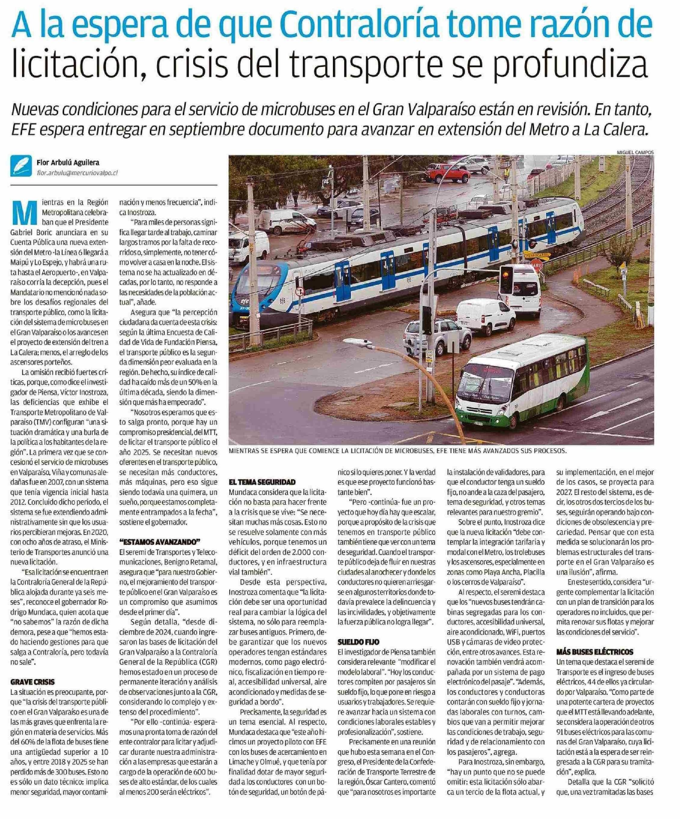 A la espera de que Contraloría tome razón de licitación, crisis del transporte se profundiza 08-06-2025 El Mercurio de Valparaíso |