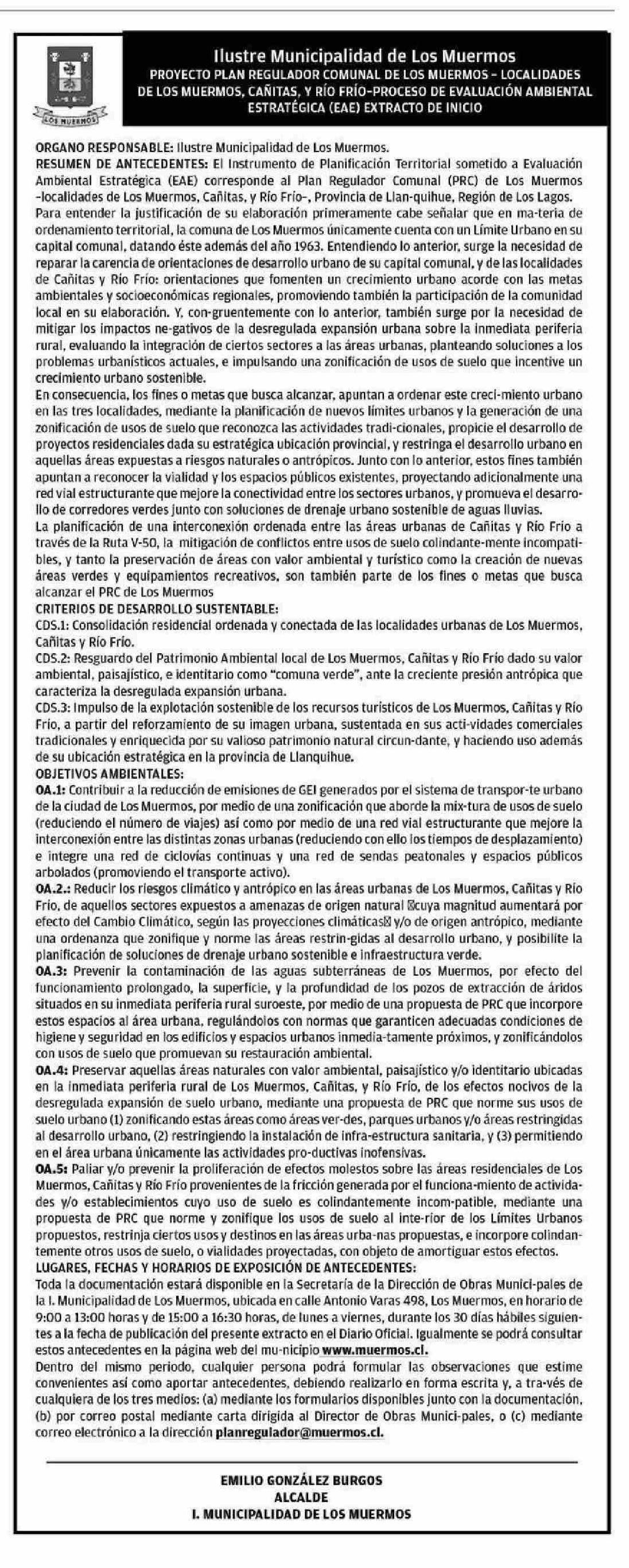 Extractos: Ilustre Municipalidad de Los Muermos PROYECTO PLAN REGULADOR COMUNAL DE LOS MUERMOS - LOCALIDADESDE LOS MUERMOS, CAÑITAS, Y RÍO FRIO-PROCESO DE EVALUACIÓN AMBIENTALESTRATÉGICA (EAE) EXTRACTO DE INICIO
