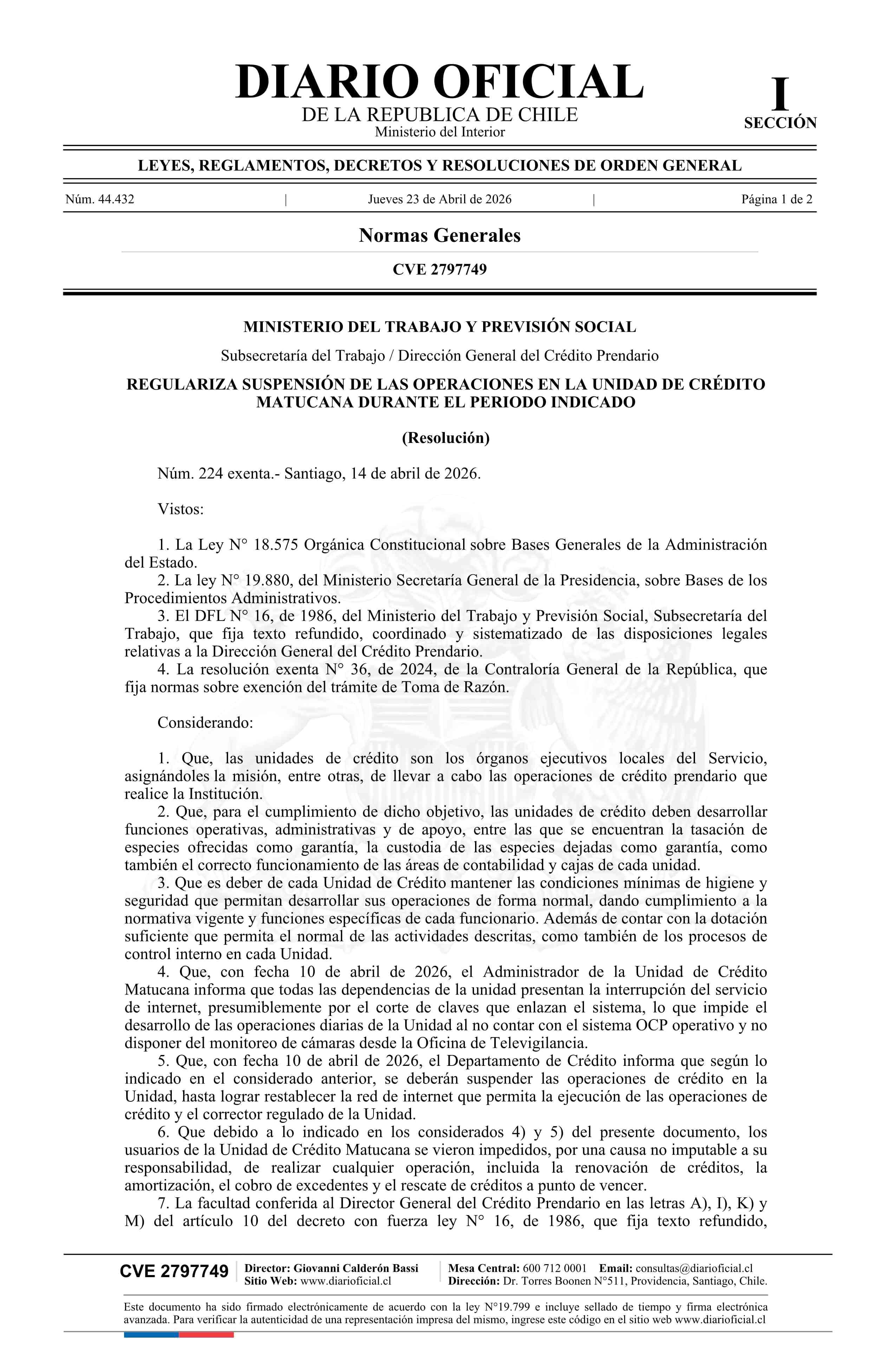Título: Resolución exenta número 224, de 2026.- Regulariza suspensión de las operaciones en la Unidad de Crédito Matucana durante el periodo indicado
