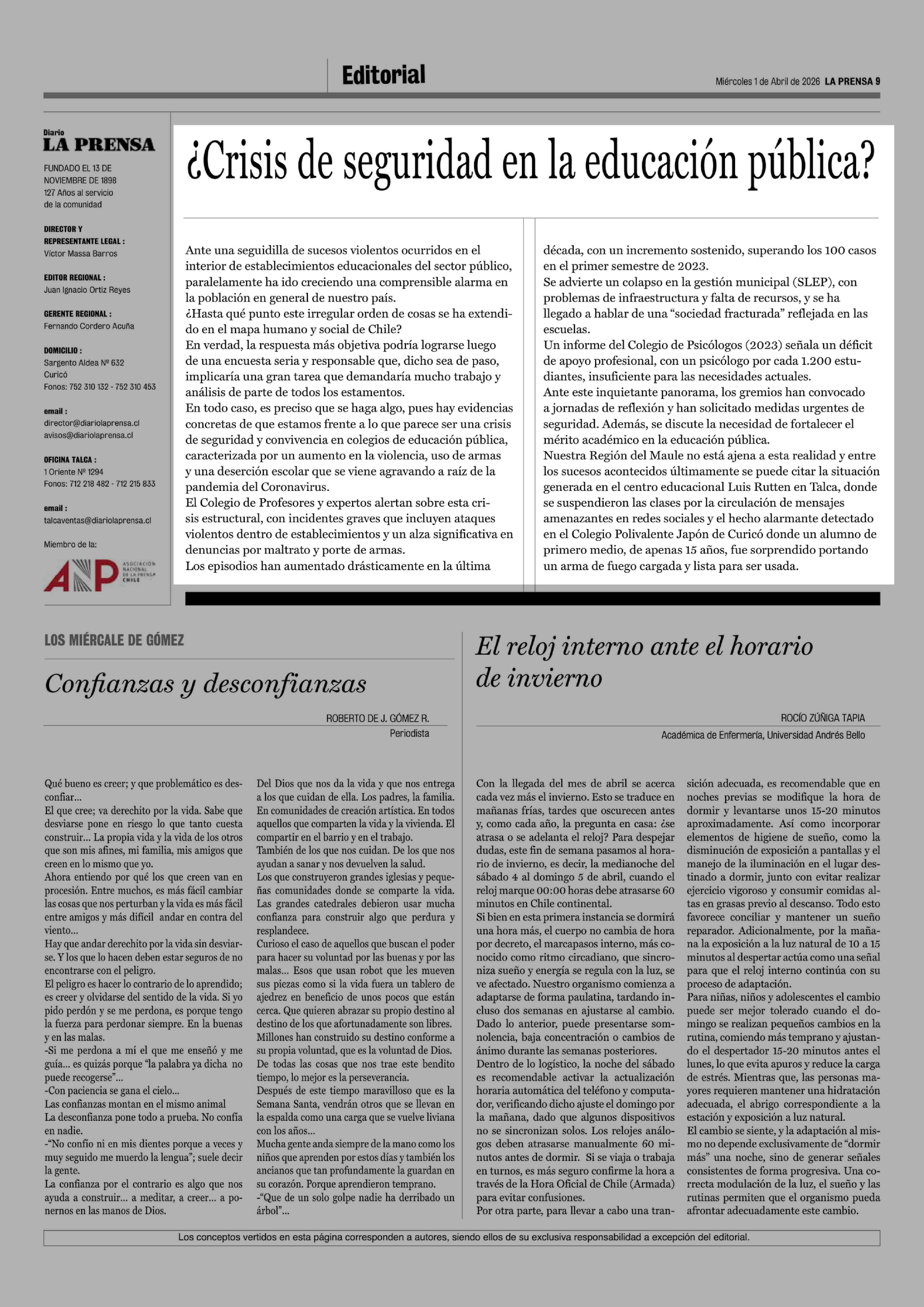 Editorial: ¿Crisis de seguridad en la educación pública? 01-04-2026 La Prensa de Curicó |