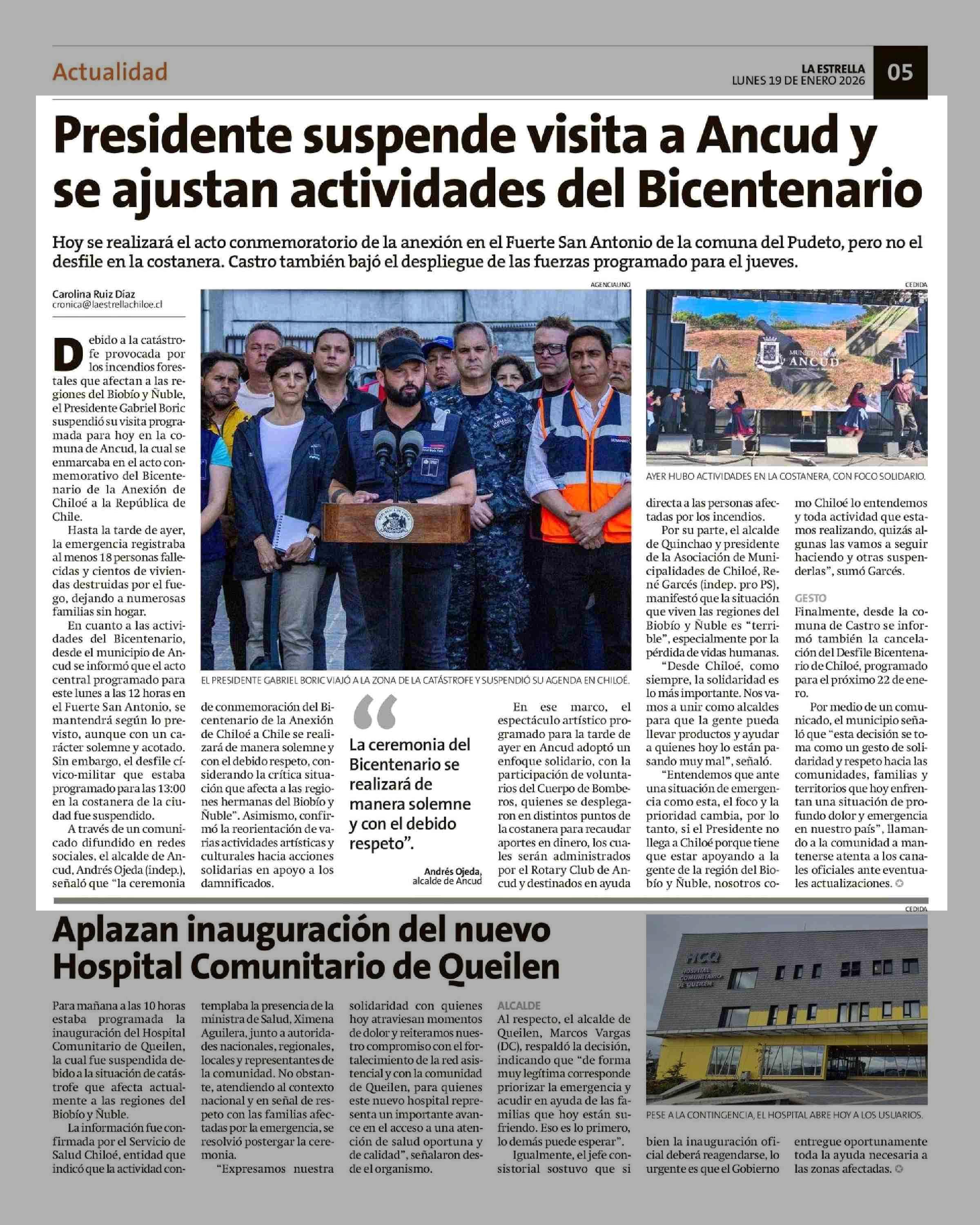 Presidente suspende visita a Ancud y se ajustan actividades del Bicentenario 19-01-2026 La Estrella de Chiloé |
