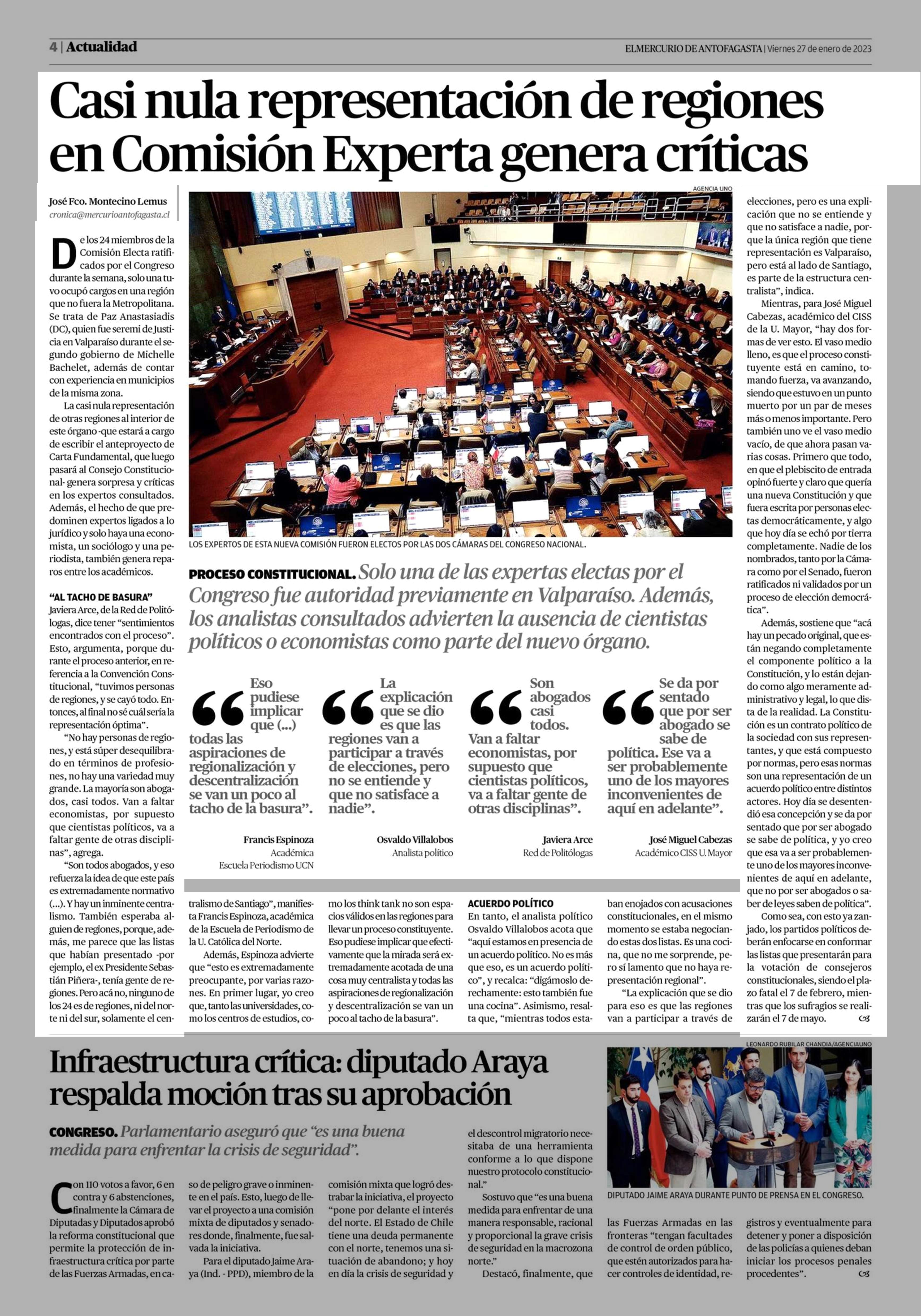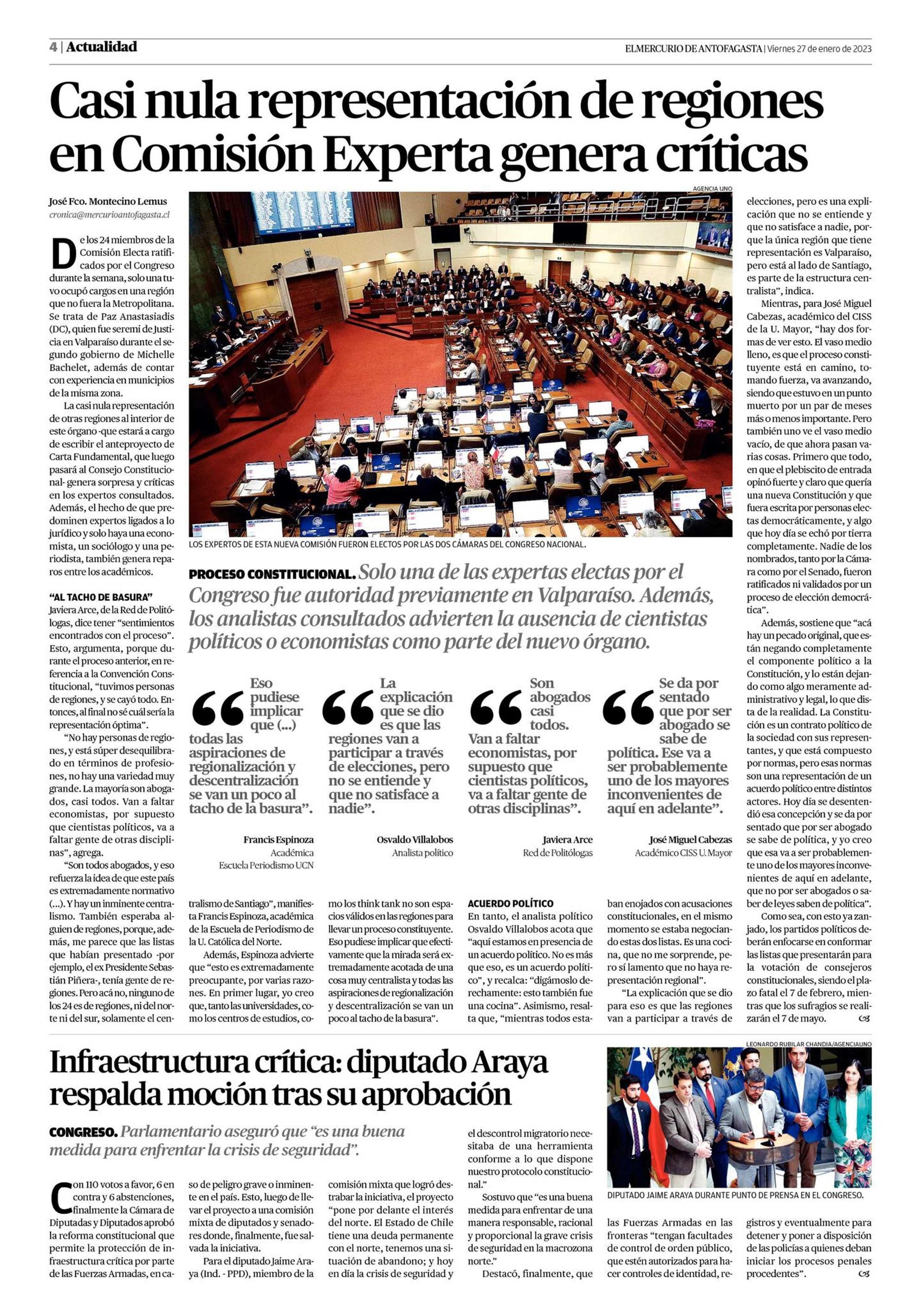 Casi nula representación de regiones en Comisión Experta genera críticas 27-01-2023 El Mercurio de Antofagasta |