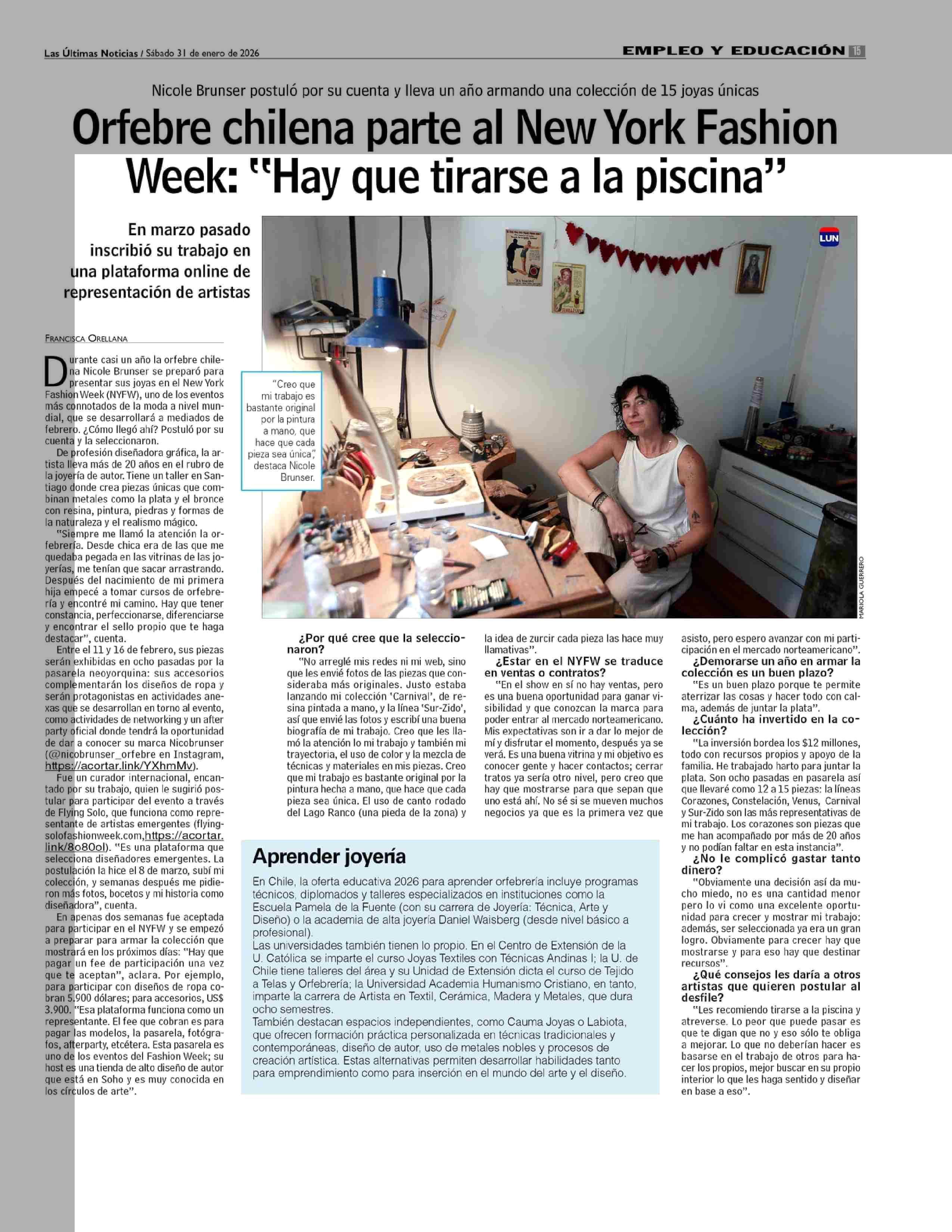 Orfebre chilena parte al New York Fashion Week: "Hay que tirarse a la piscina" 31-01-2026 Las Últimas Noticias |