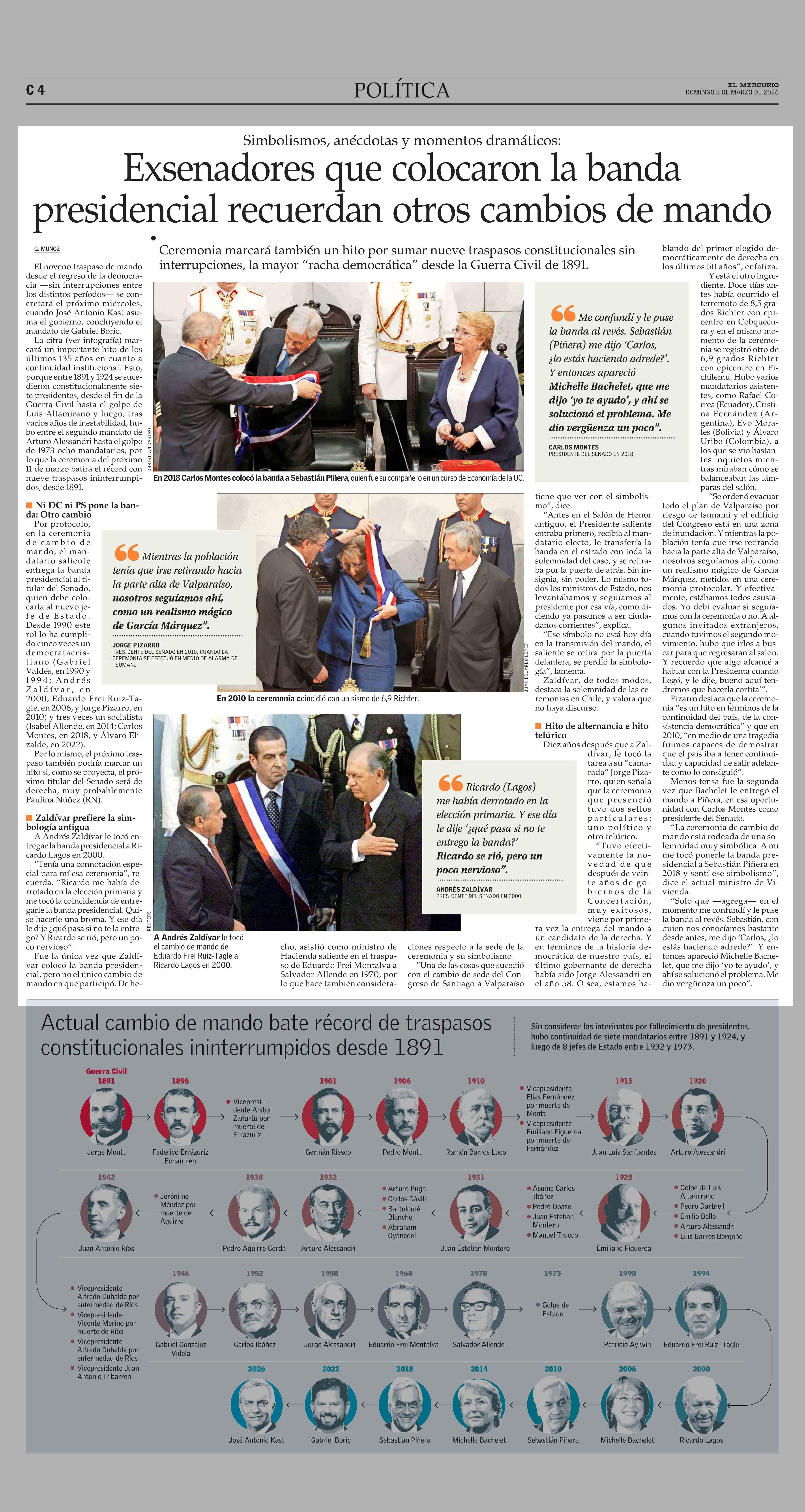 Exsenadores que colocaron la banda presidencial recuerdan otros cambios de mando 08-03-2026 El Mercurio |