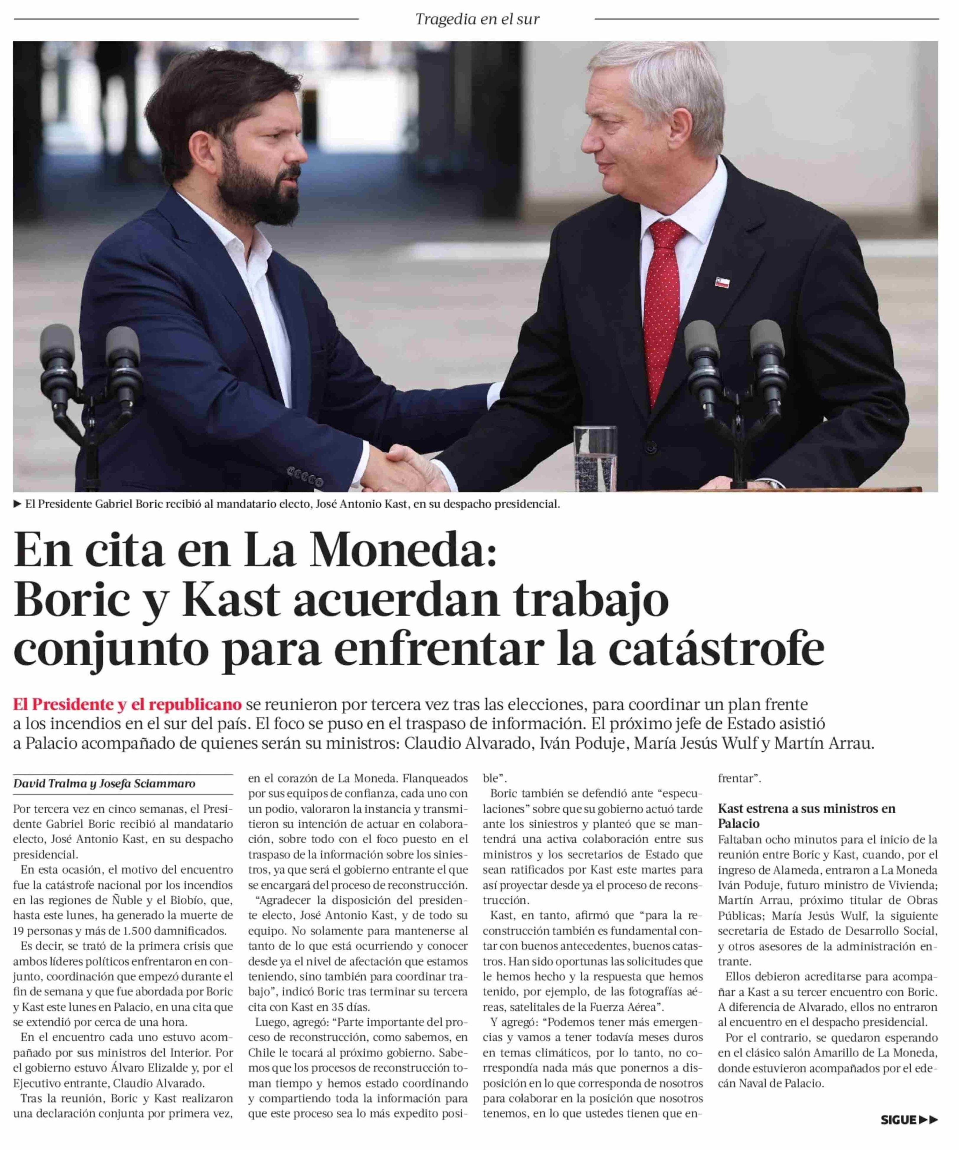 En cita en La Moneda: Boric y Kast acuerdan trabajo conjunto para enfrentar la catástrofe 20-01-2026 La Tercera |