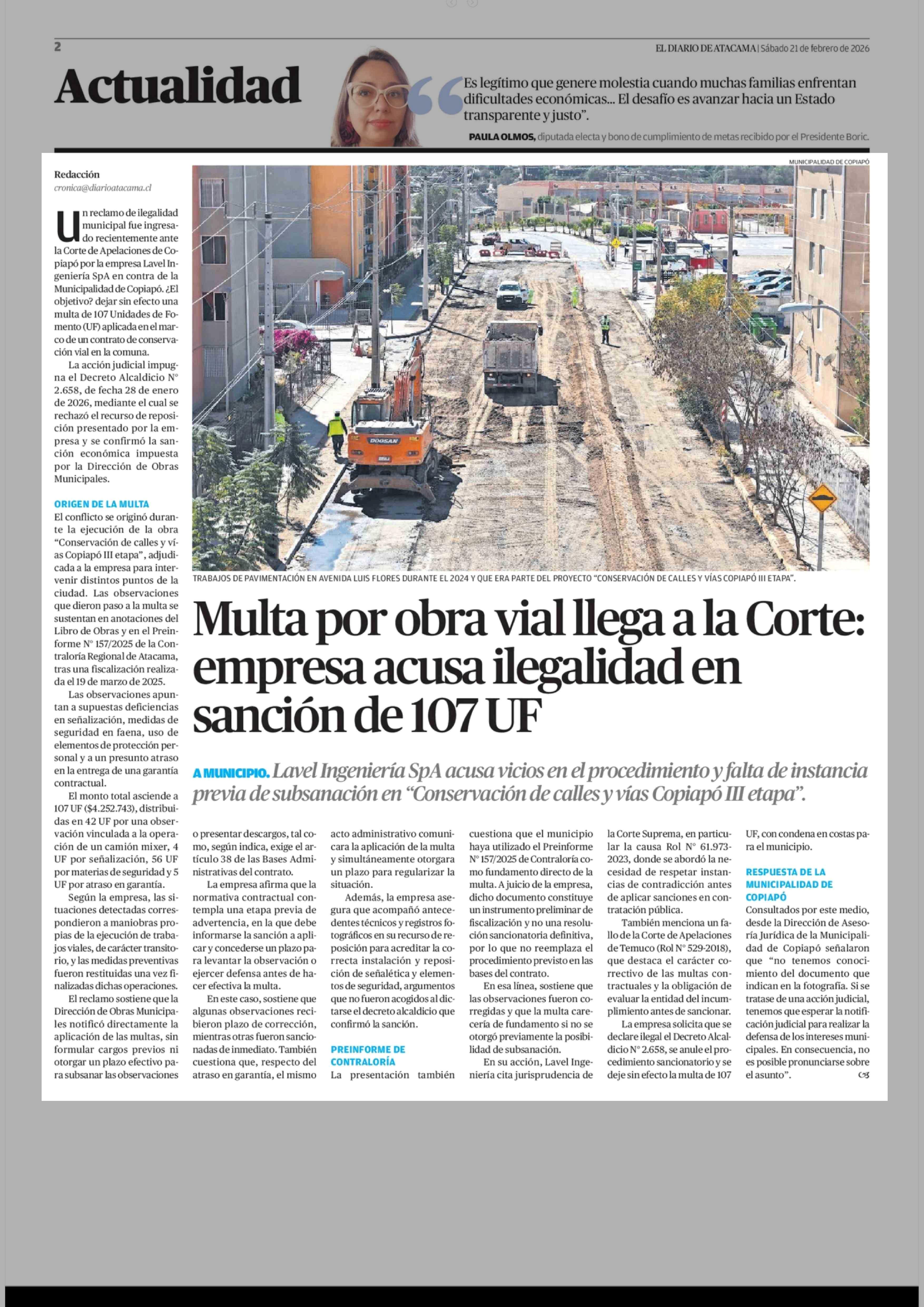 Multa por obra vial llega a la Corte: empresa acusa ilegalidad en sanción de 107 UF 21-02-2026 El Diario de Atacama |