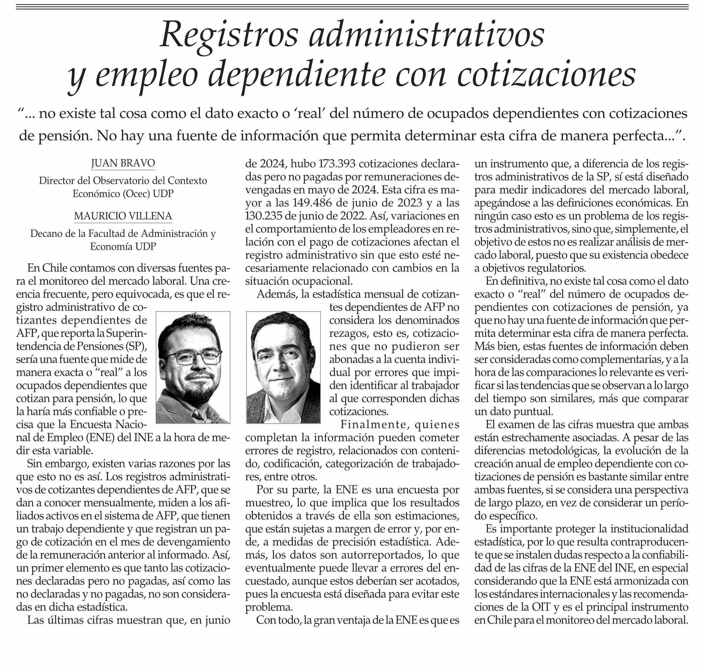 COLUMNAS DE OPINIÓN: Registros administrativos y empleo dependiente con cotizaciones 29-08-2024 El Mercurio |