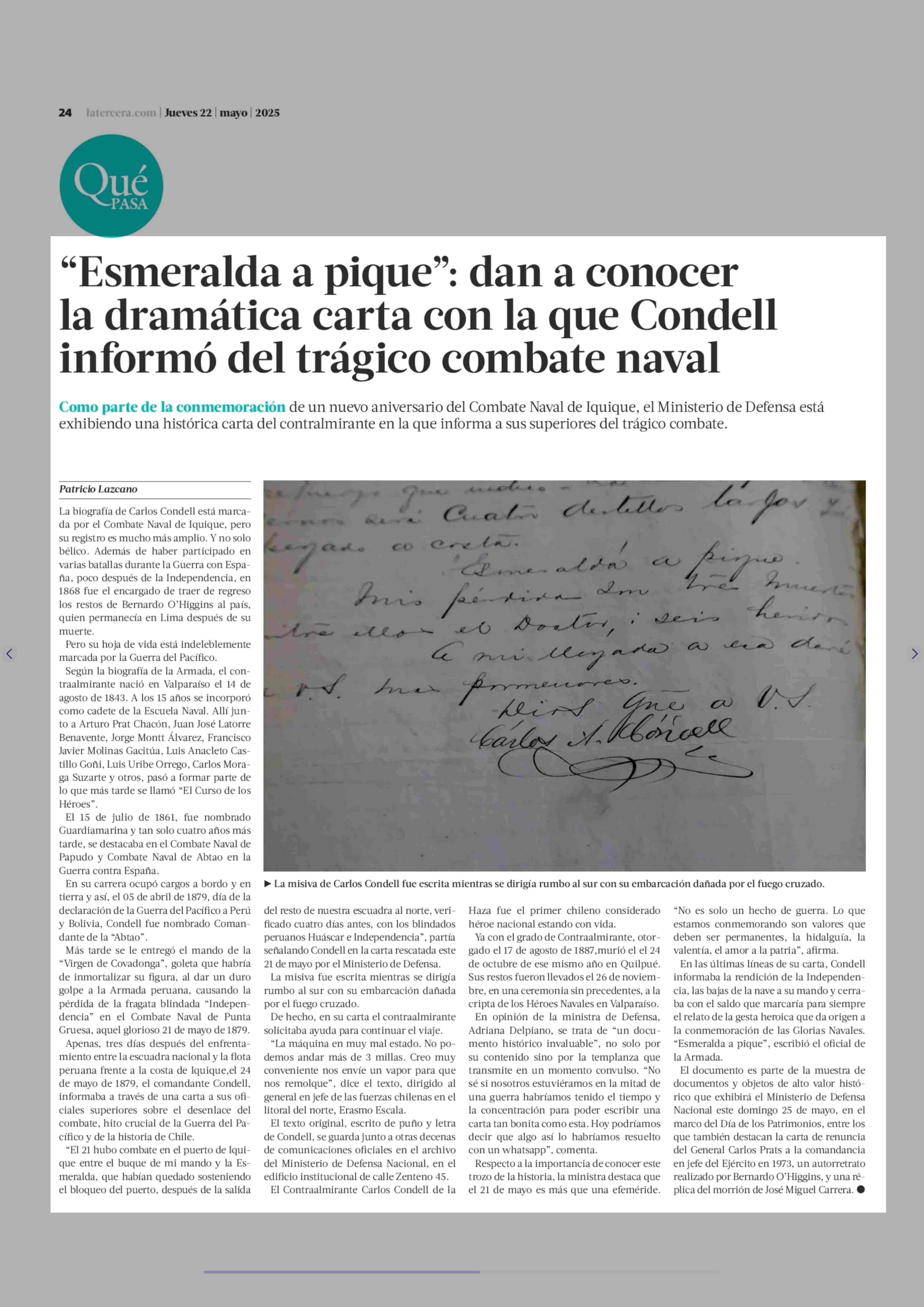 “Esmeralda a pique”: dan a conocer la dramática carta con la que Condell informó del trágico combate naval 22-05-2025 La Tercera |