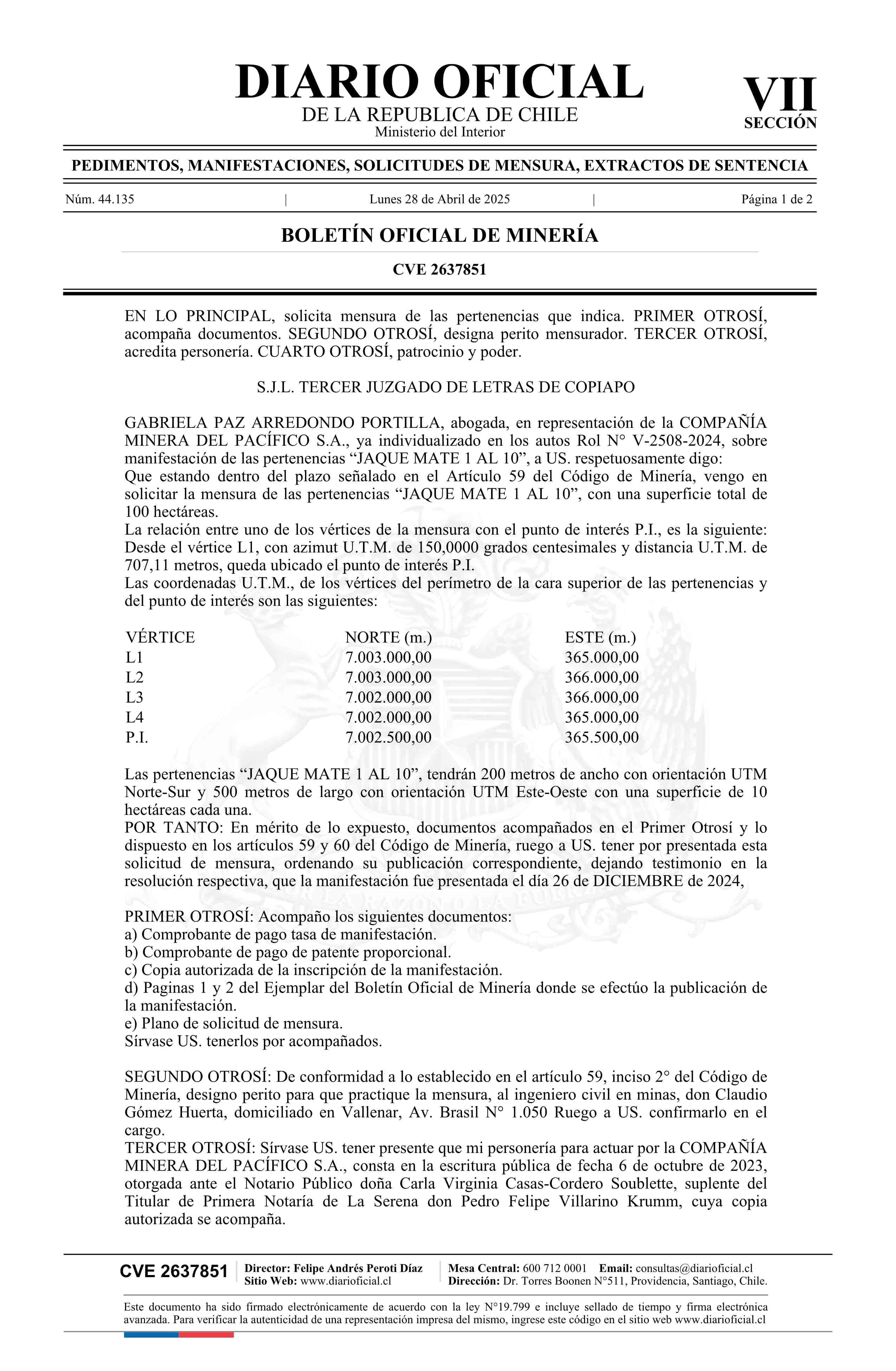 JAQUE MATE 1 AL 10 / Compañía Minera del Pacífico S.A. 28-04-2025 DIARIO OFICIAL CHILE - BOLETÍN OFICIAL DE MINERÍA |