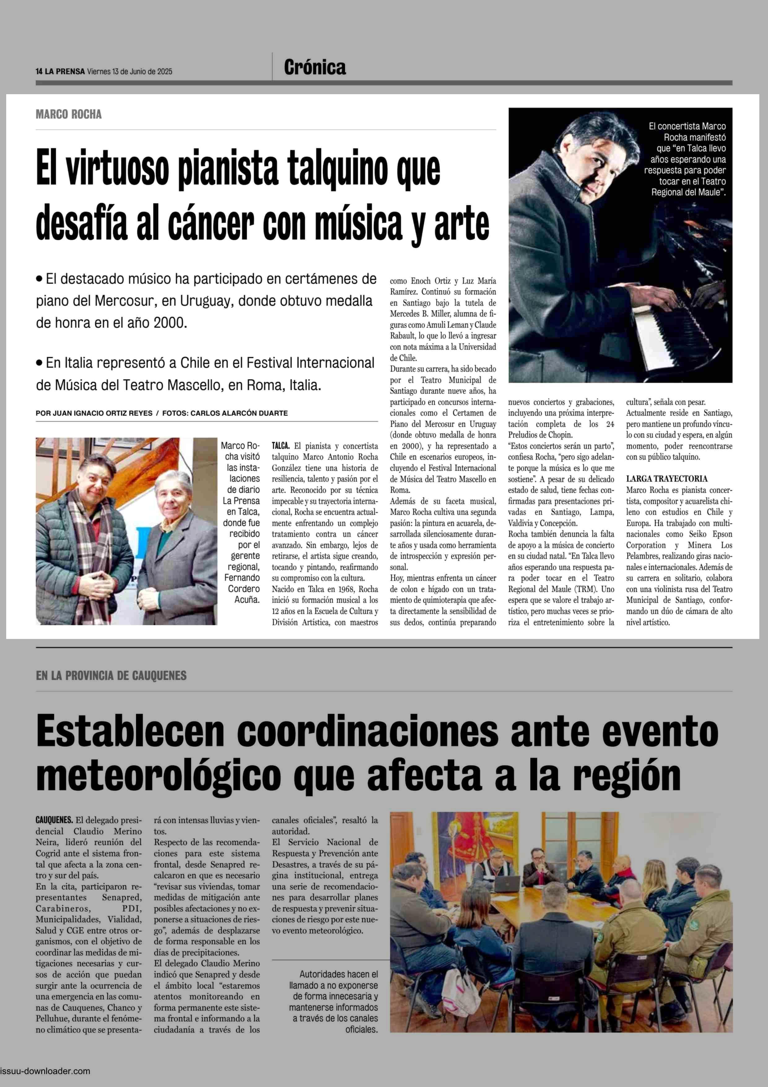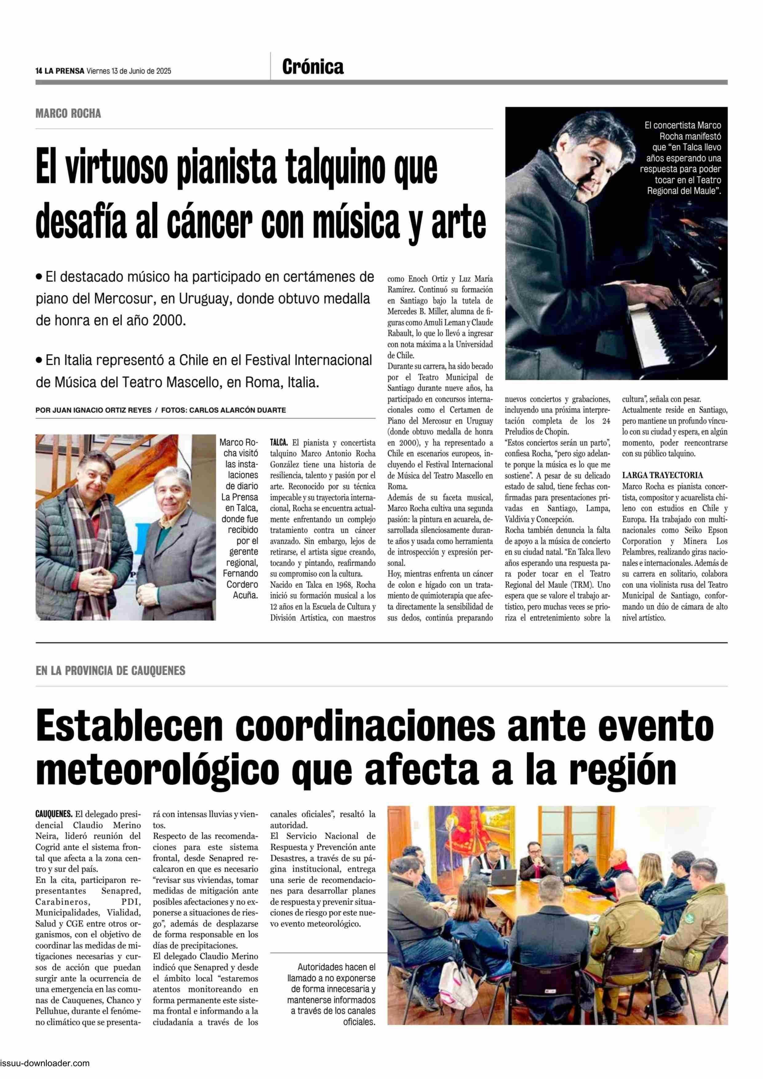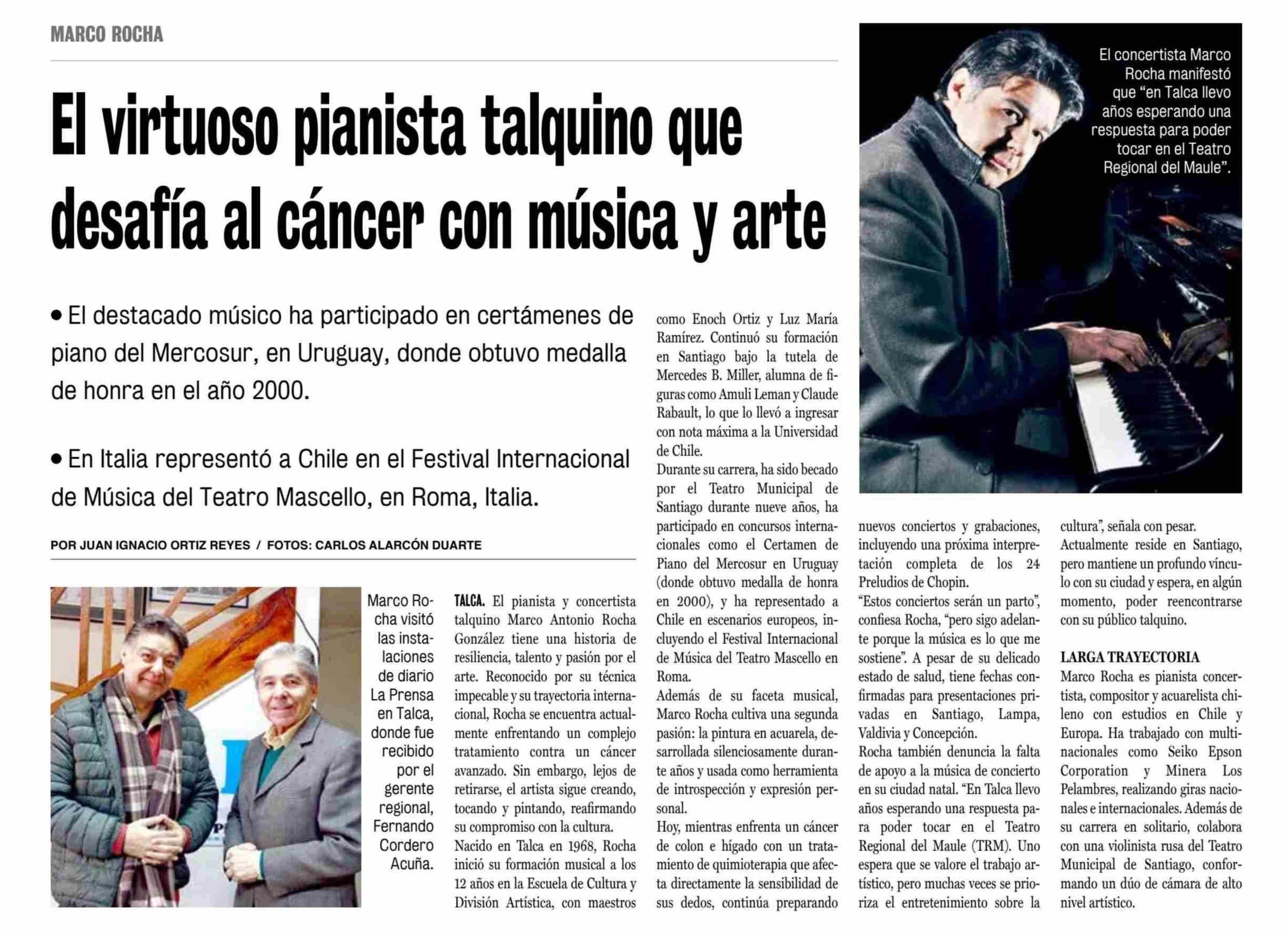 El virtuoso pianista talquino que desafía al cáncer con música y arte 13-06-2025 La Prensa de Curicó |