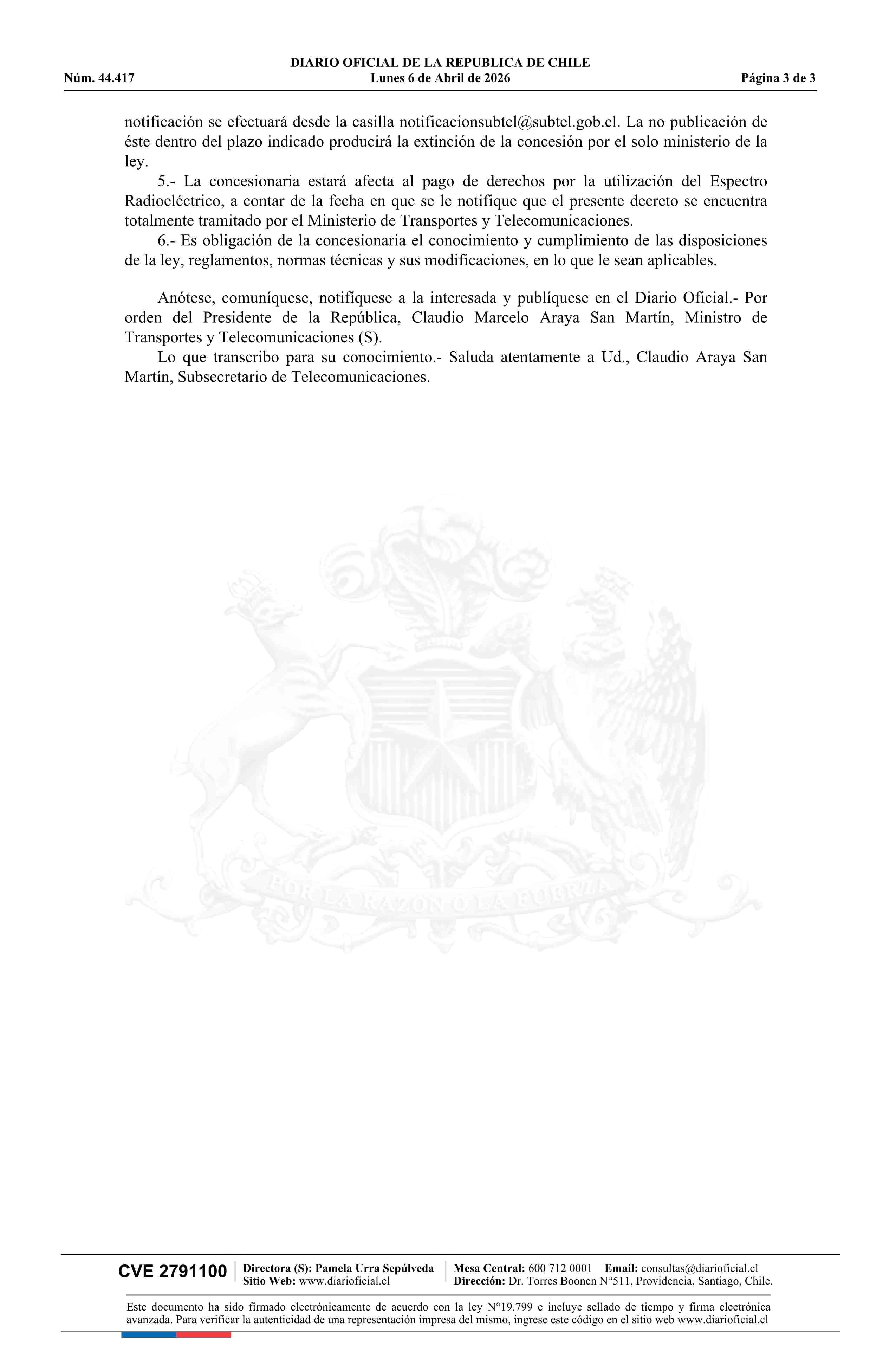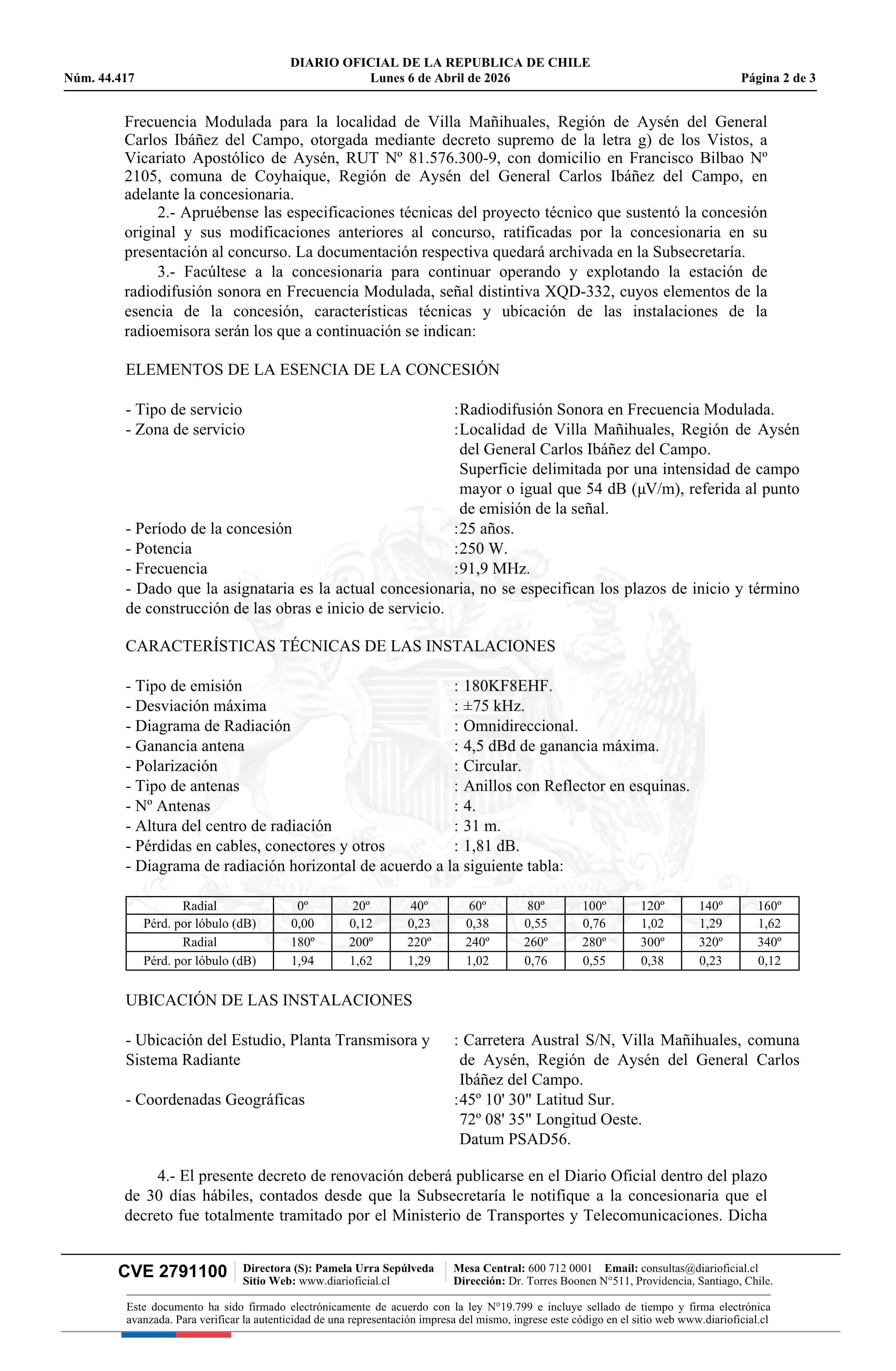 Decreto exento número 1.055, de 2025.- Renueva concesión de radiodifusión sonora en frecuencia modulada para la localidad de Villa Mañihuales 06-04-2026 Diario Oficial Edición Electrónica |