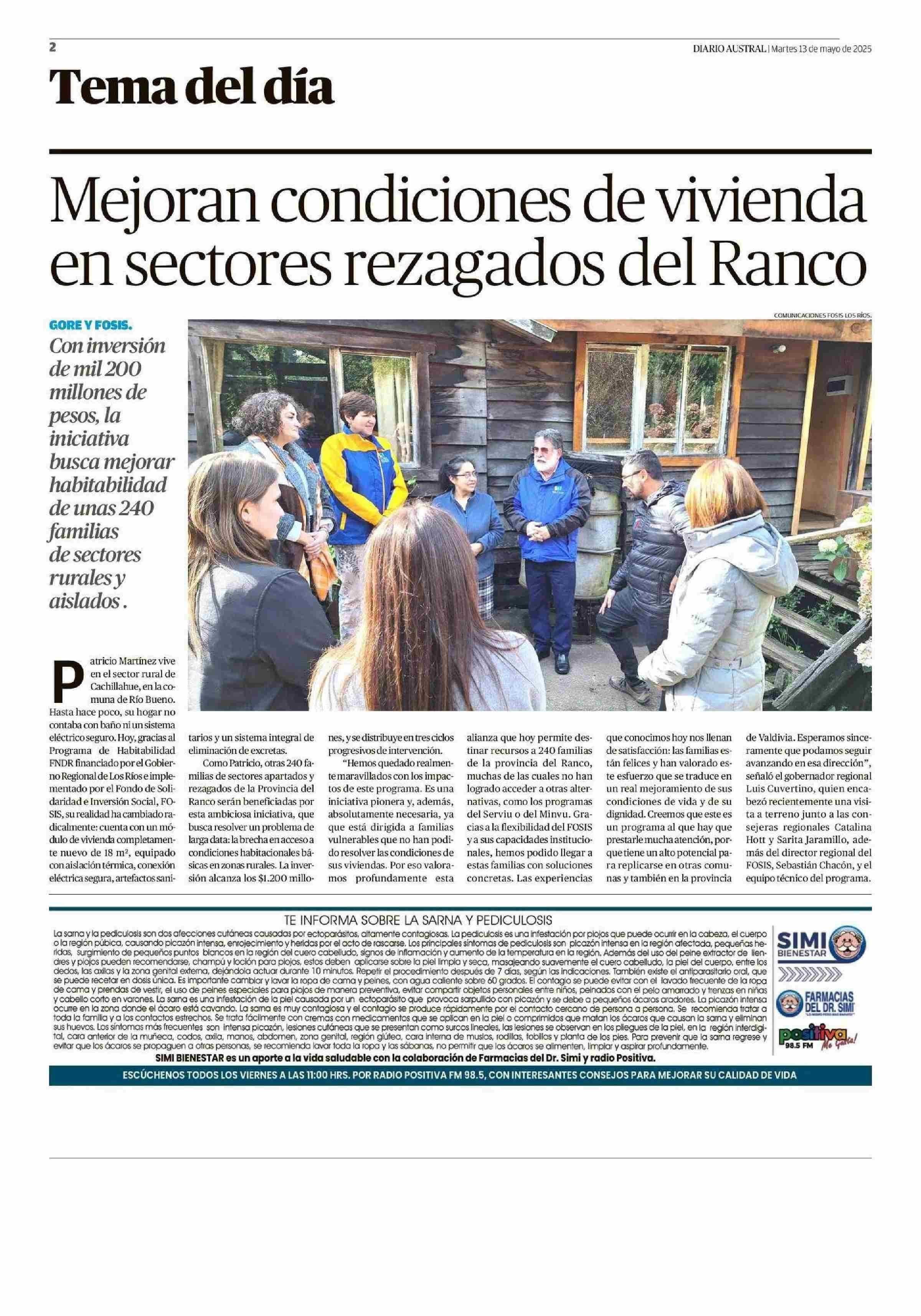 Mejoran condiciones de vivienda en sectores rezagados del Ranco 13-05-2025 Diario Austral Región de Los Ríos |