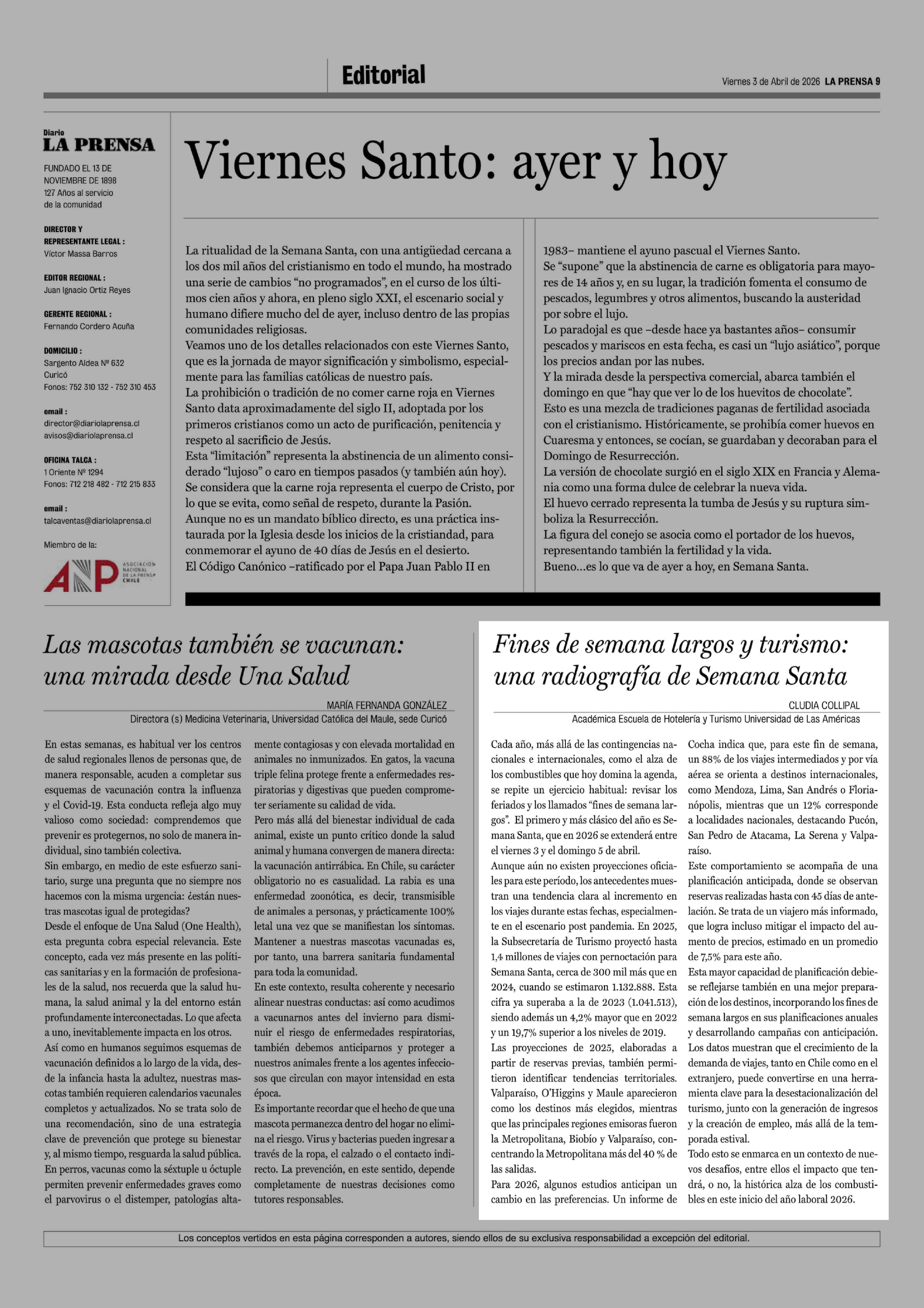 Cartas: Fines de semana largos y turismo: una radiografía de Semana Santa 03-04-2026 La Prensa de Curicó |