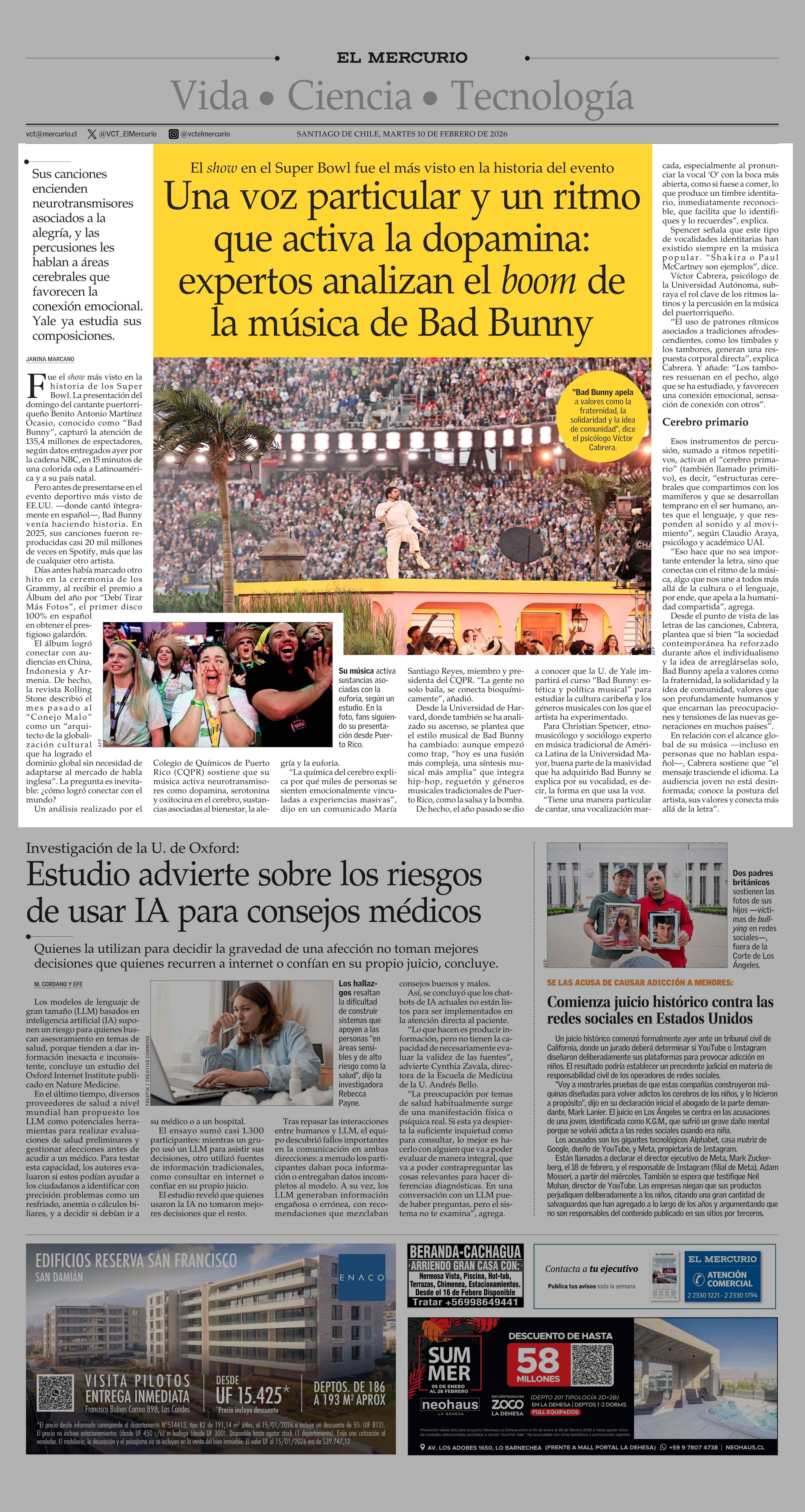 Una voz particular y un ritmo que activa la dopamina: expertos analizan el boom de la música de Bad Bunny 10-02-2026 El Mercurio |