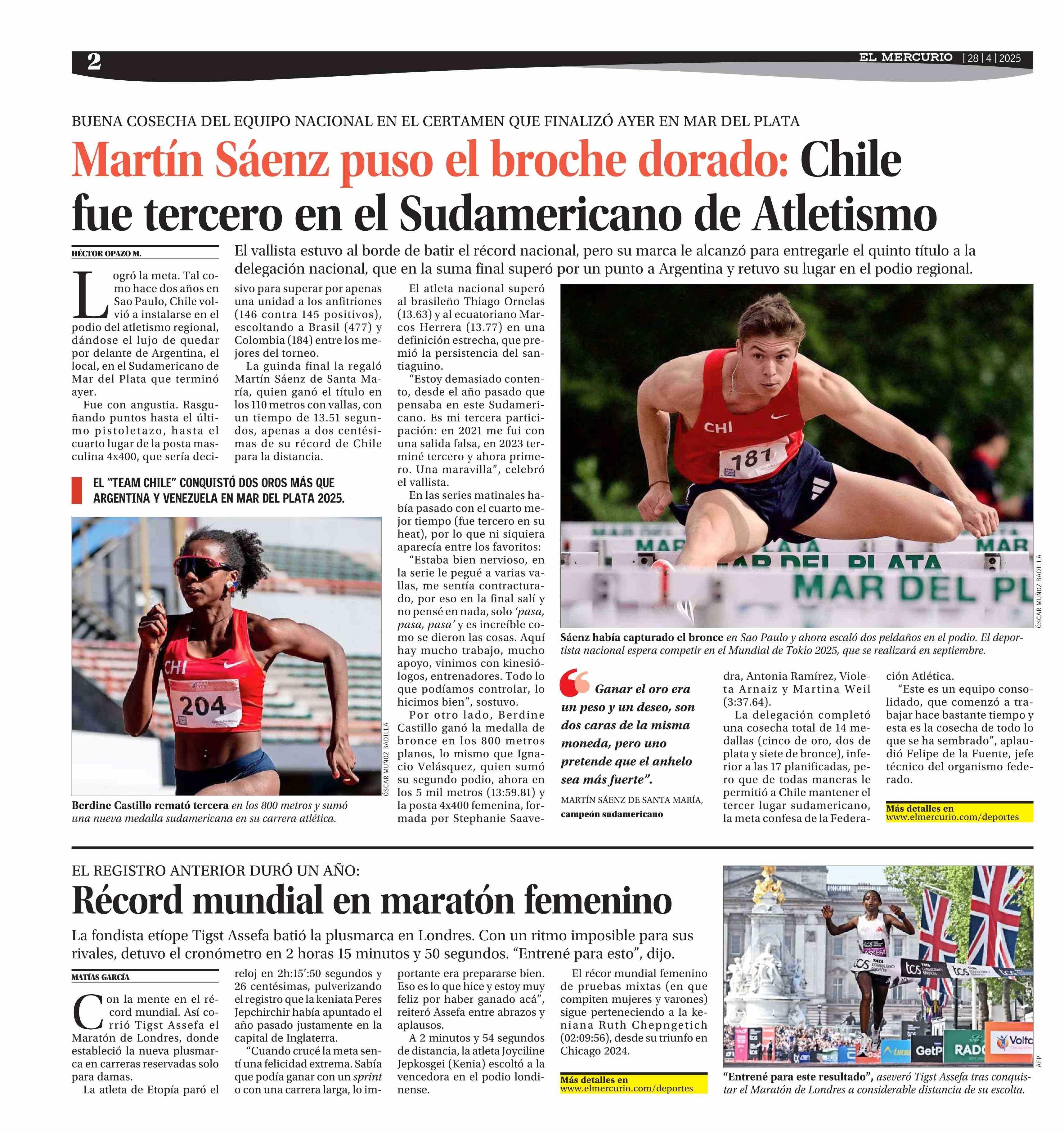 Martín Sáenz puso el broche dorado: Chile fue tercero en el Sudamericano de Atletismo 28-04-2025 El Mercurio |