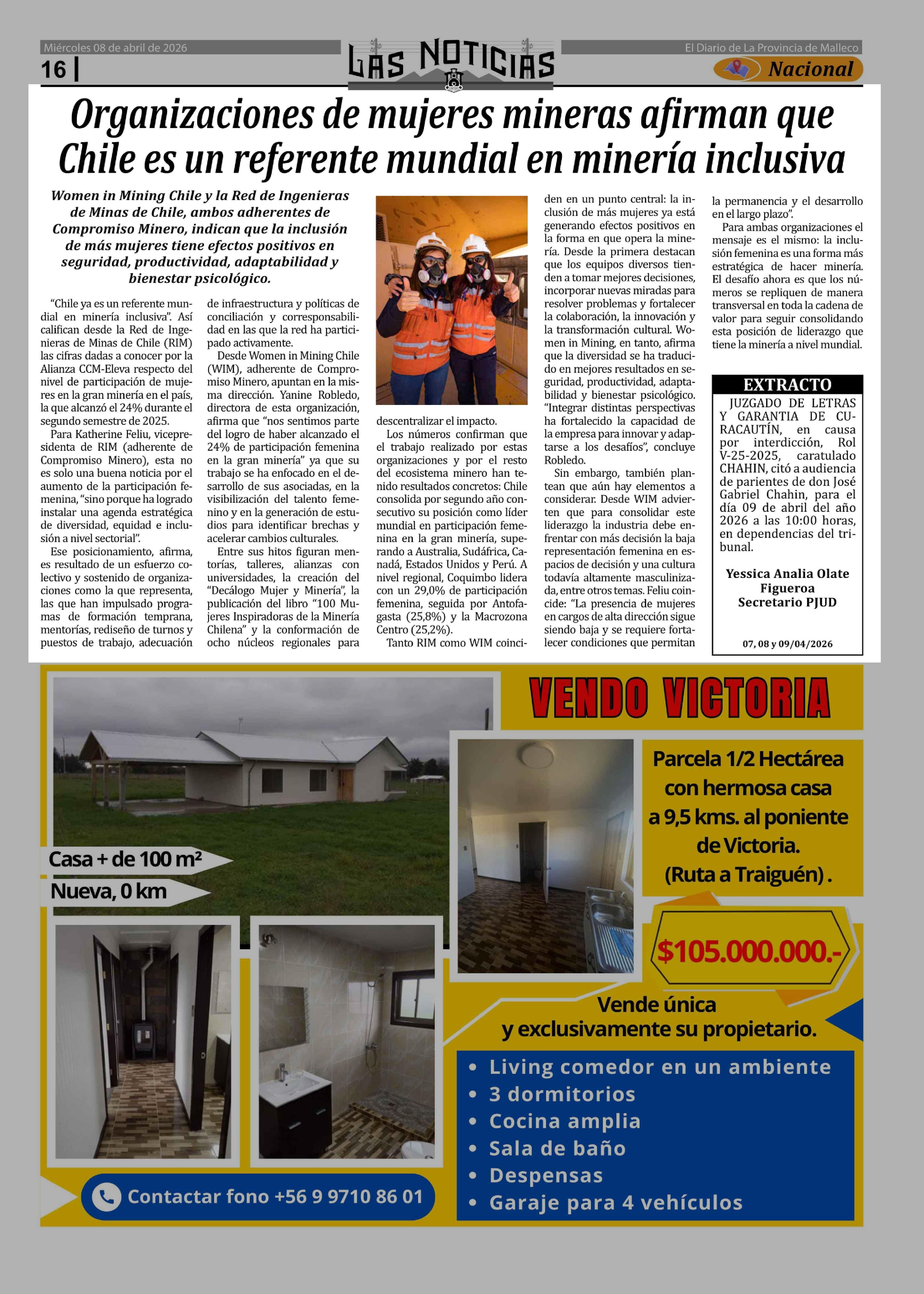Organizaciones de mujeres mineras afirman que Chile es un referente mundial en minería inclusiva 08-04-2026 Las Noticias |