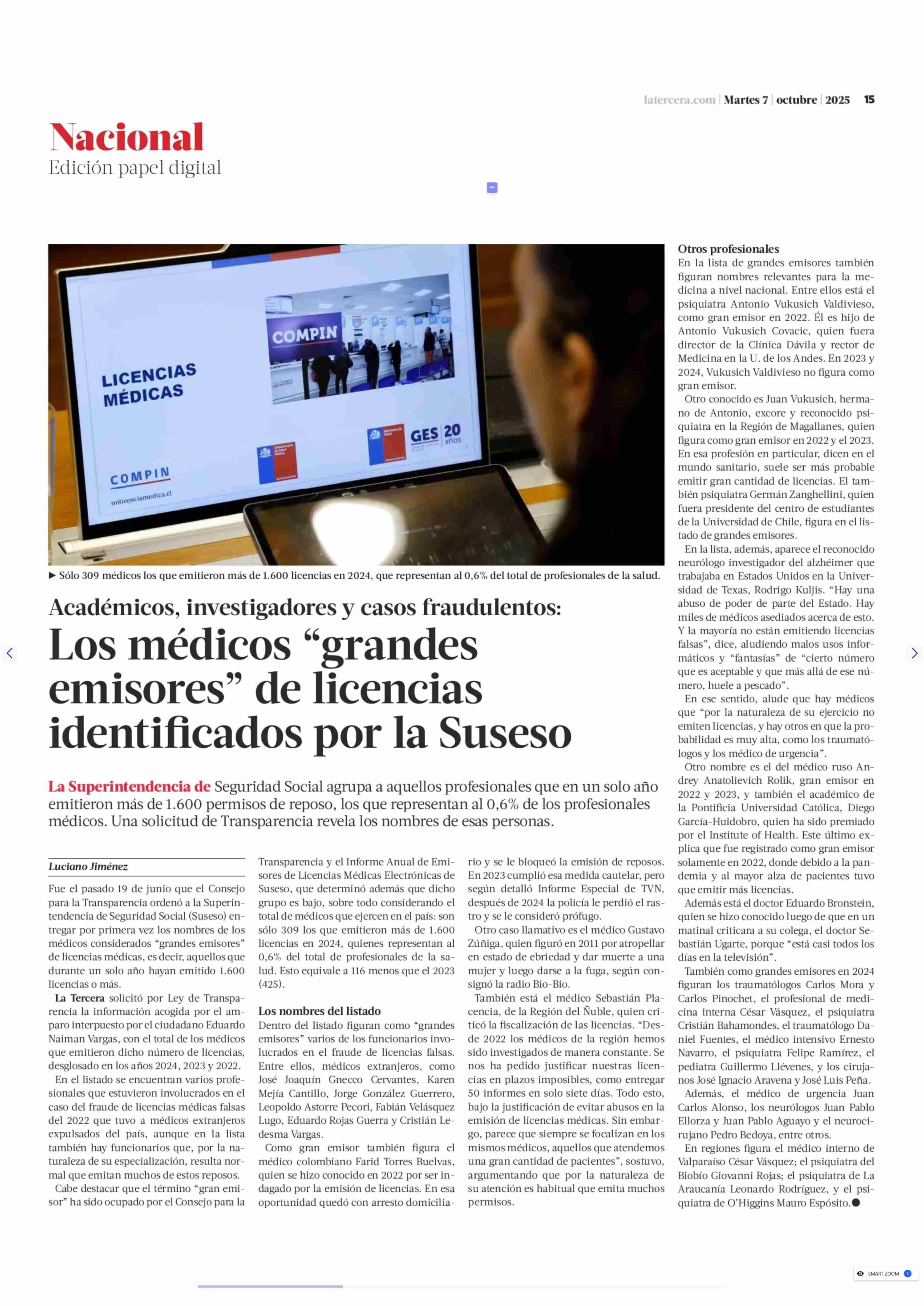 Título: Los médicos "grandes emisores" de licencias identificados por la Suseso
