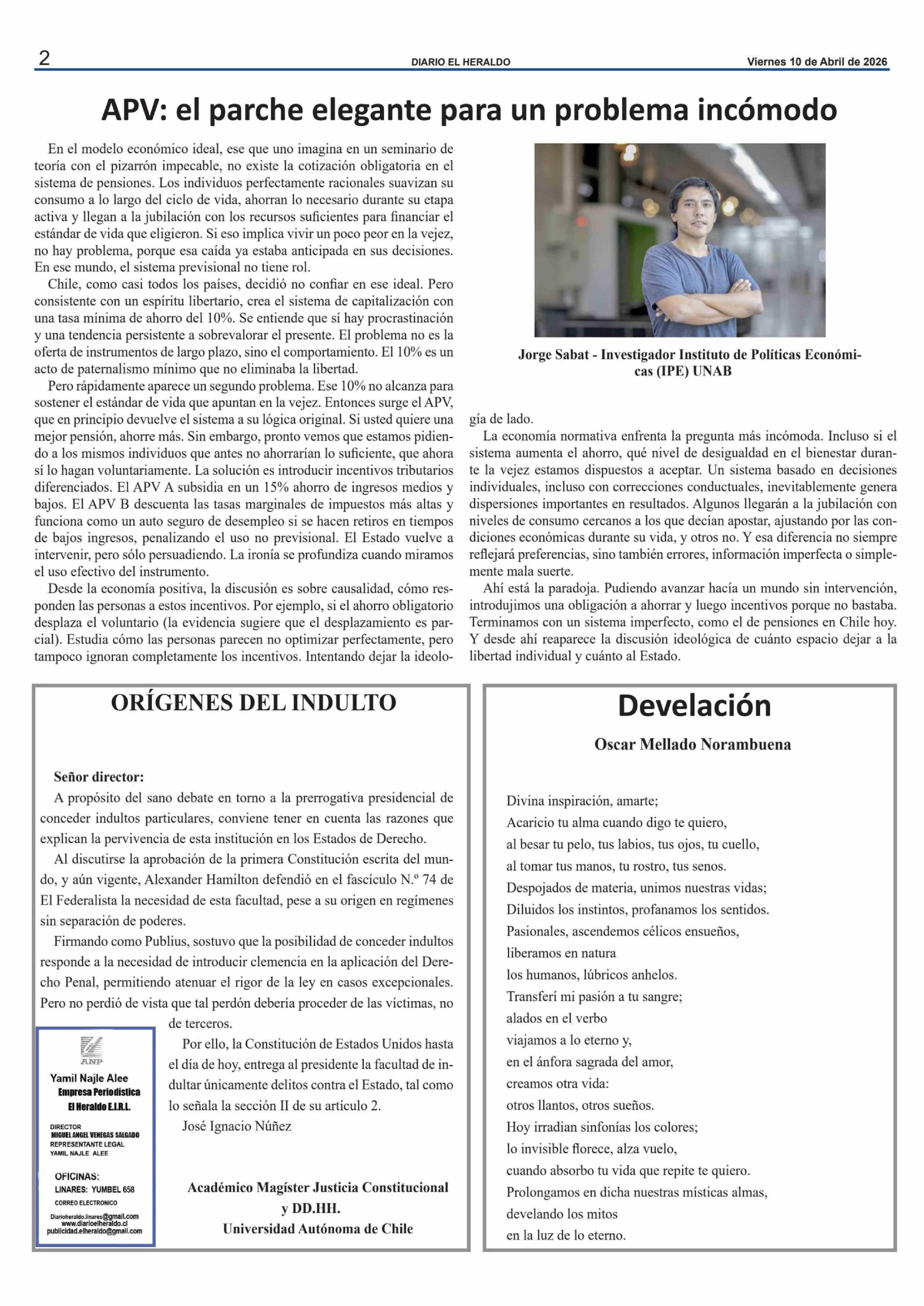 Columnas de Opinión: APV: el parche elegante para un problema incómodo 10-04-2026 El Heraldo |