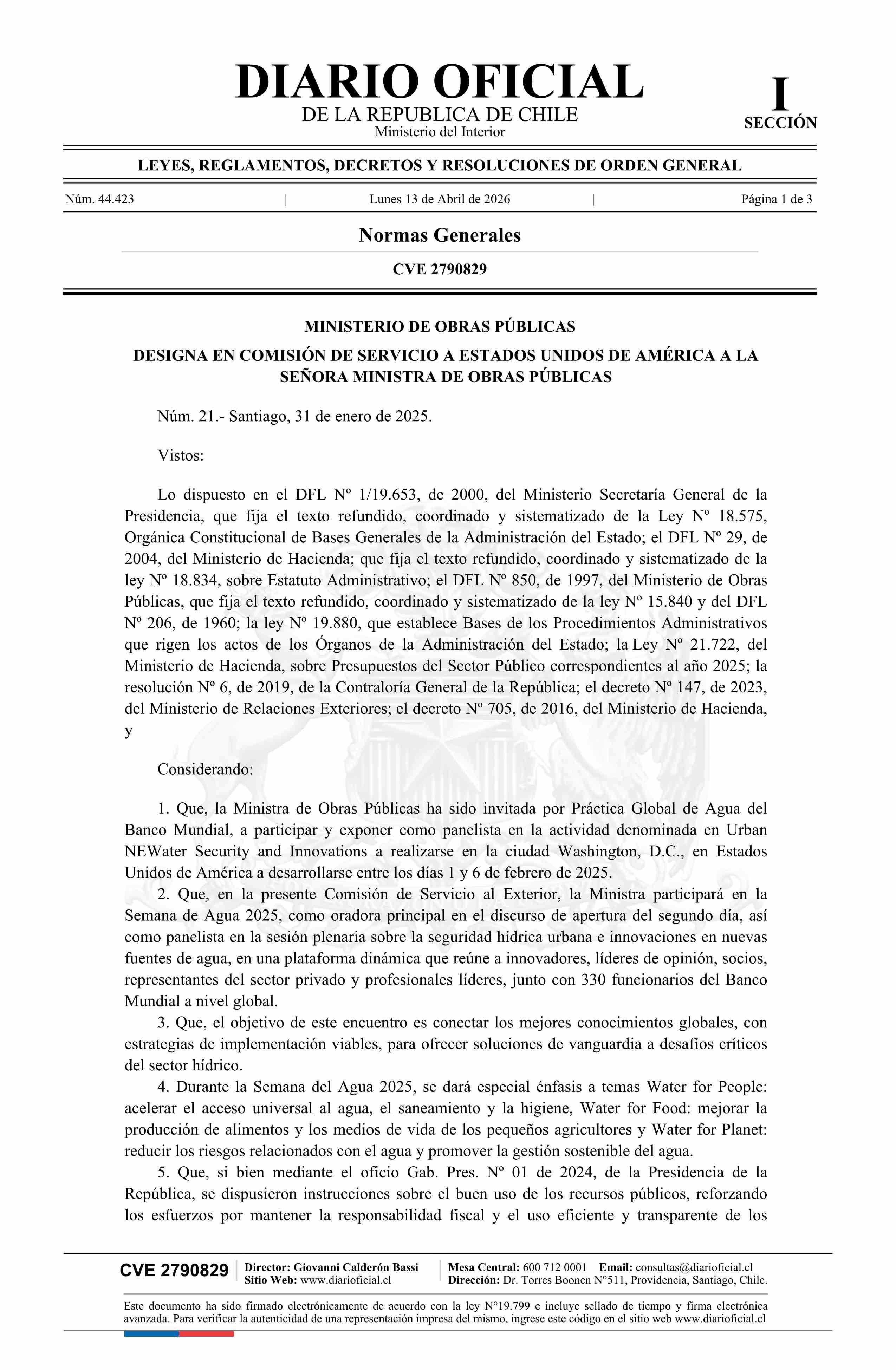 | Título: | Decreto número 21, de 2025.- Designa en comisión de servicio al extranjero a doña Jessica López Saffie, Ministra de Obras Públicas, a la ciudad de Washington, Estados Unidos de América |