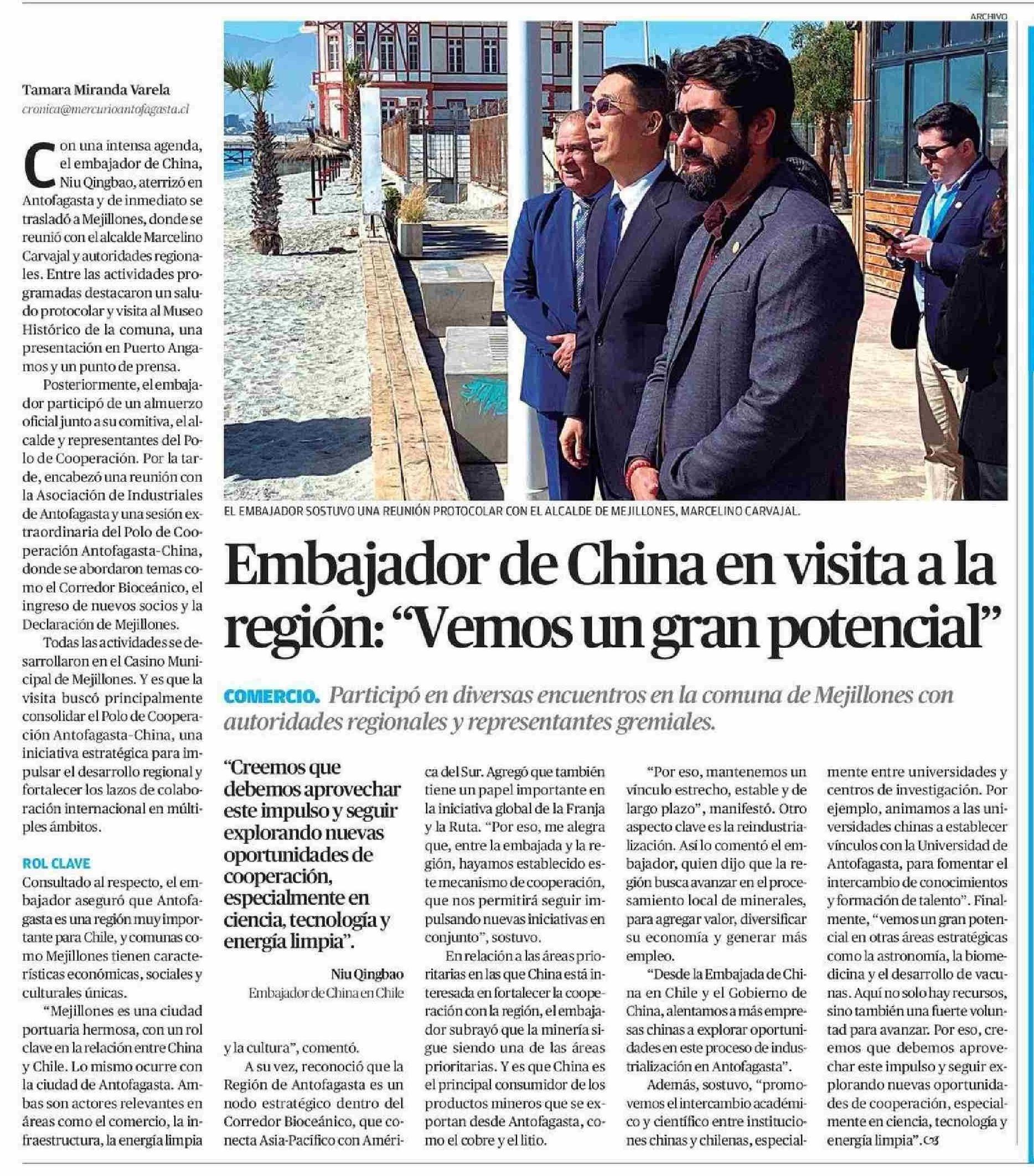Embajador de China en visita a la región: "Vemos un gran potencial" 20-06-2025 El Mercurio de Antofagasta |