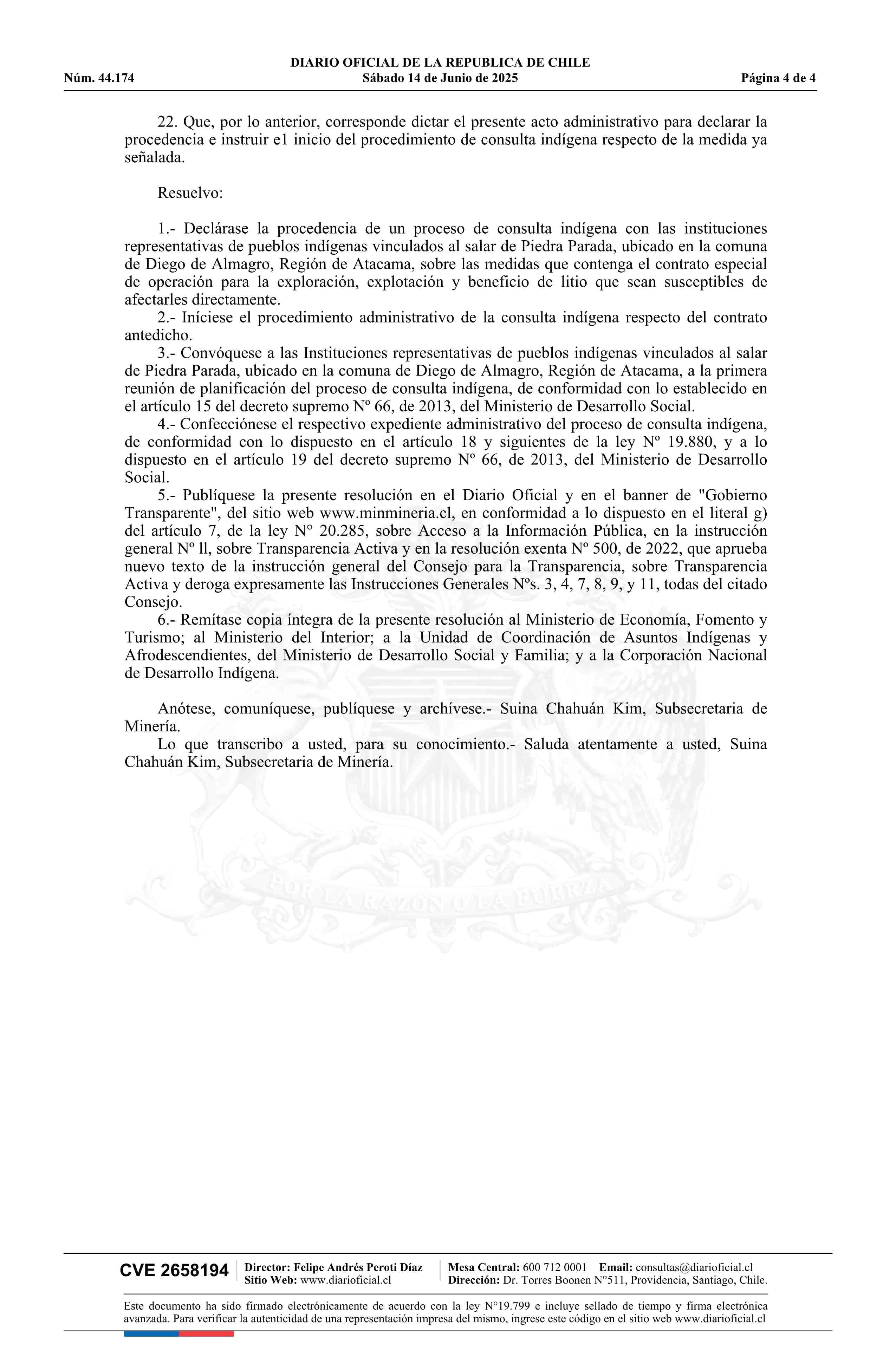 | Título: | Resolución exenta número 1.196, de 2025.- Declara la procedencia e instruye el inicio de procedimiento de consulta indígena sobre contrato especial de operación para la exploración, explotación y beneficio de litio en el Salar de Piedra Parada, de la Región de Atacama |
