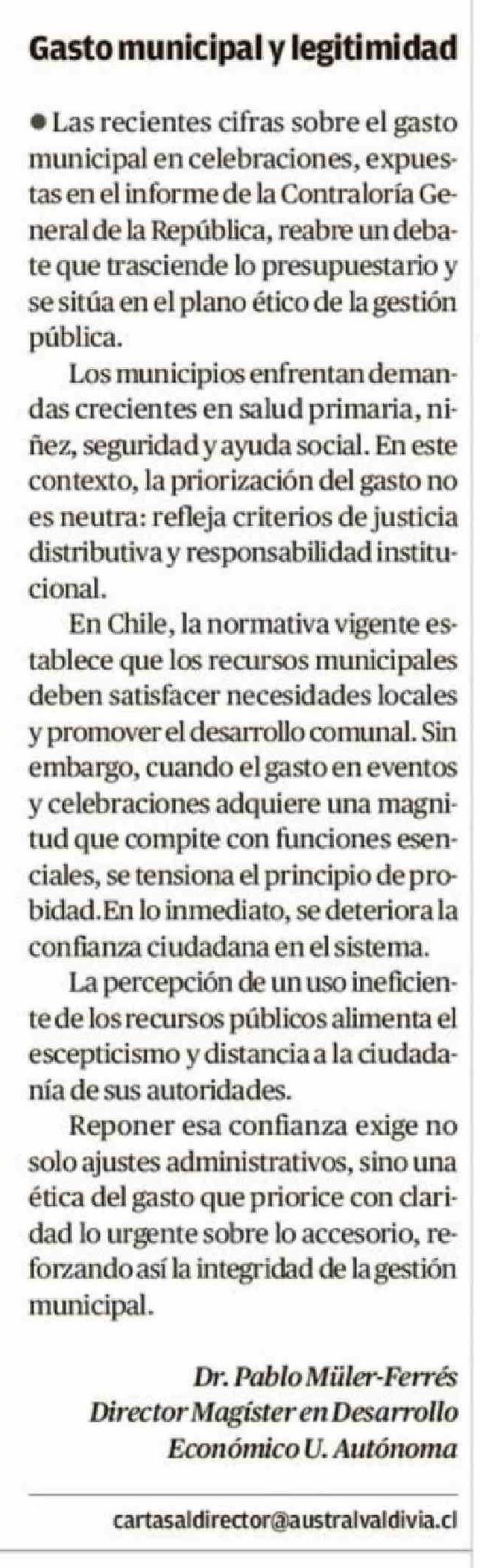 Cartas: Gasto municipal y legitimidad 21-04-2026 Diario Austral Región de Los Ríos |