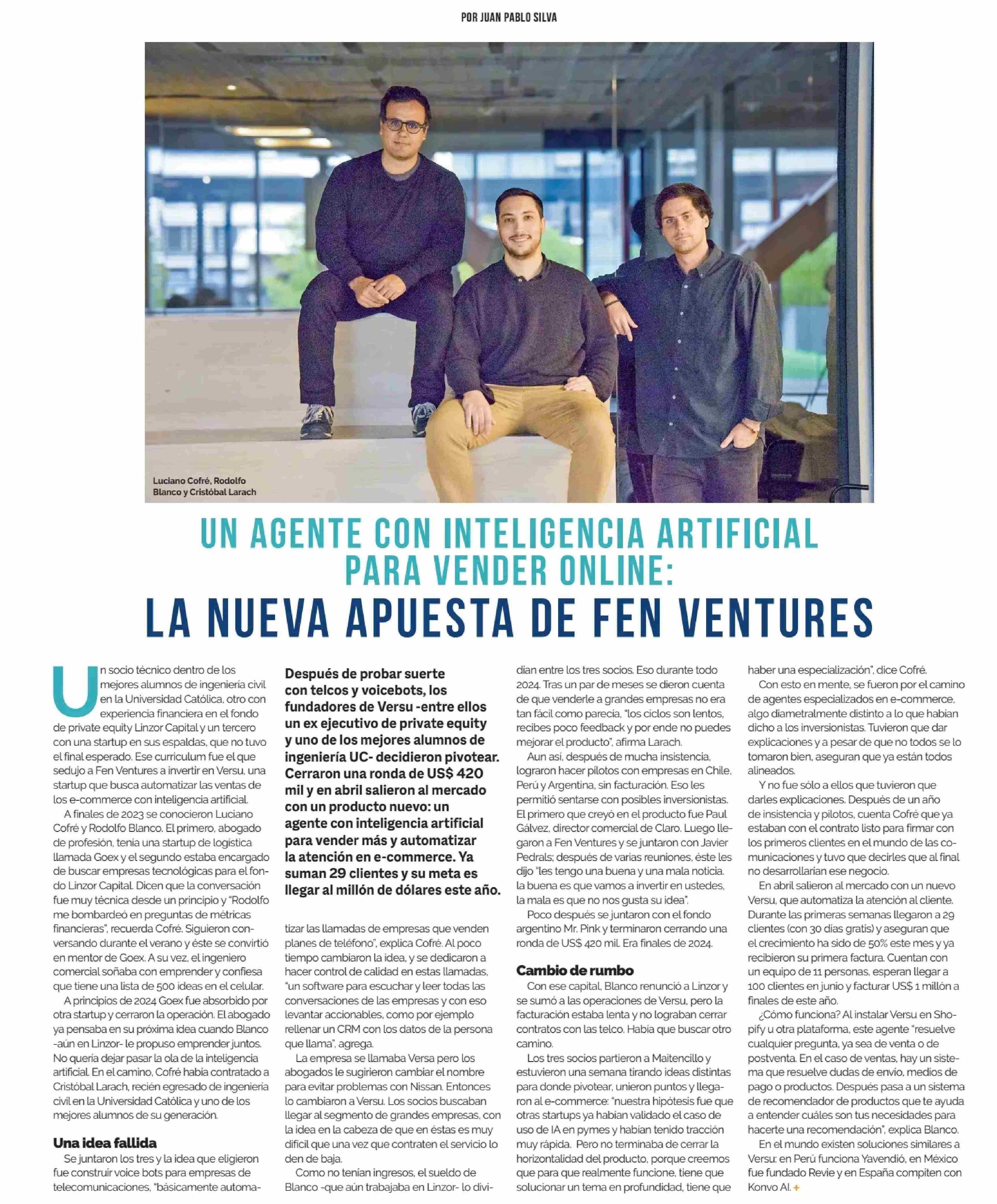 UN AGENTE CON INTELIGENCIA ARTIFICIAL PARA VENDER ONLINE: LA NUEVA APUESTA DE FEN VENTURES 01-06-2025 Diario Financiero |
