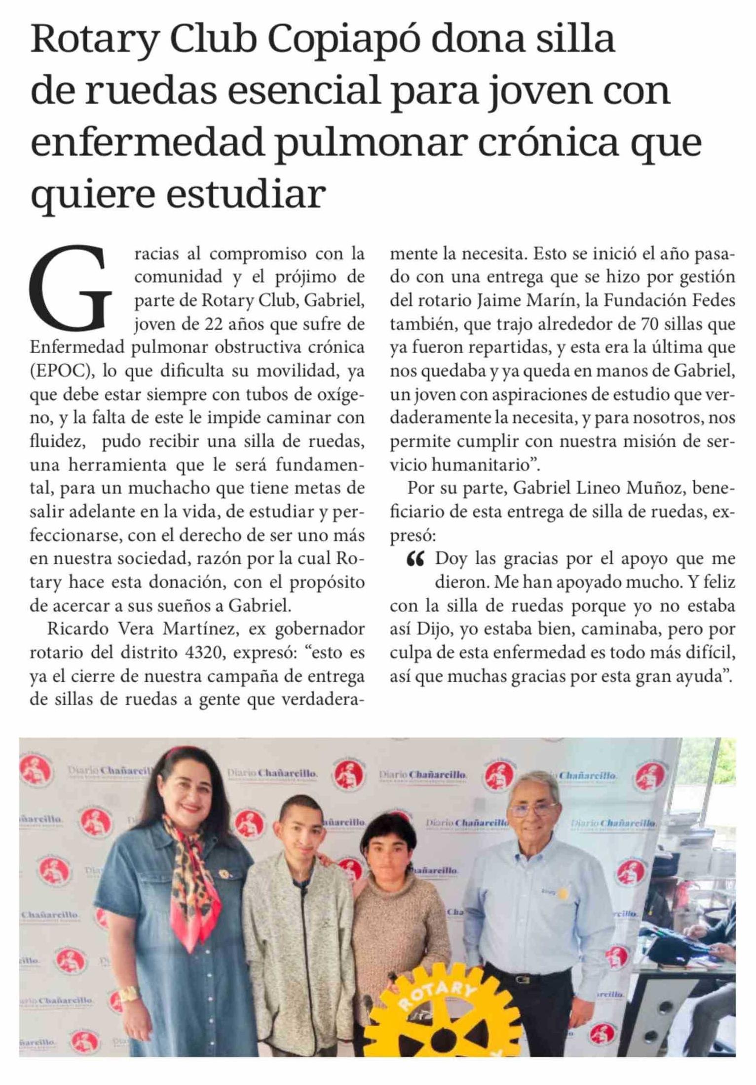 | Título: | Rotary Club Copiapó dona silla de ruedas esencial para joven con enfermedad pulmonar crónica que quiere estudiar |