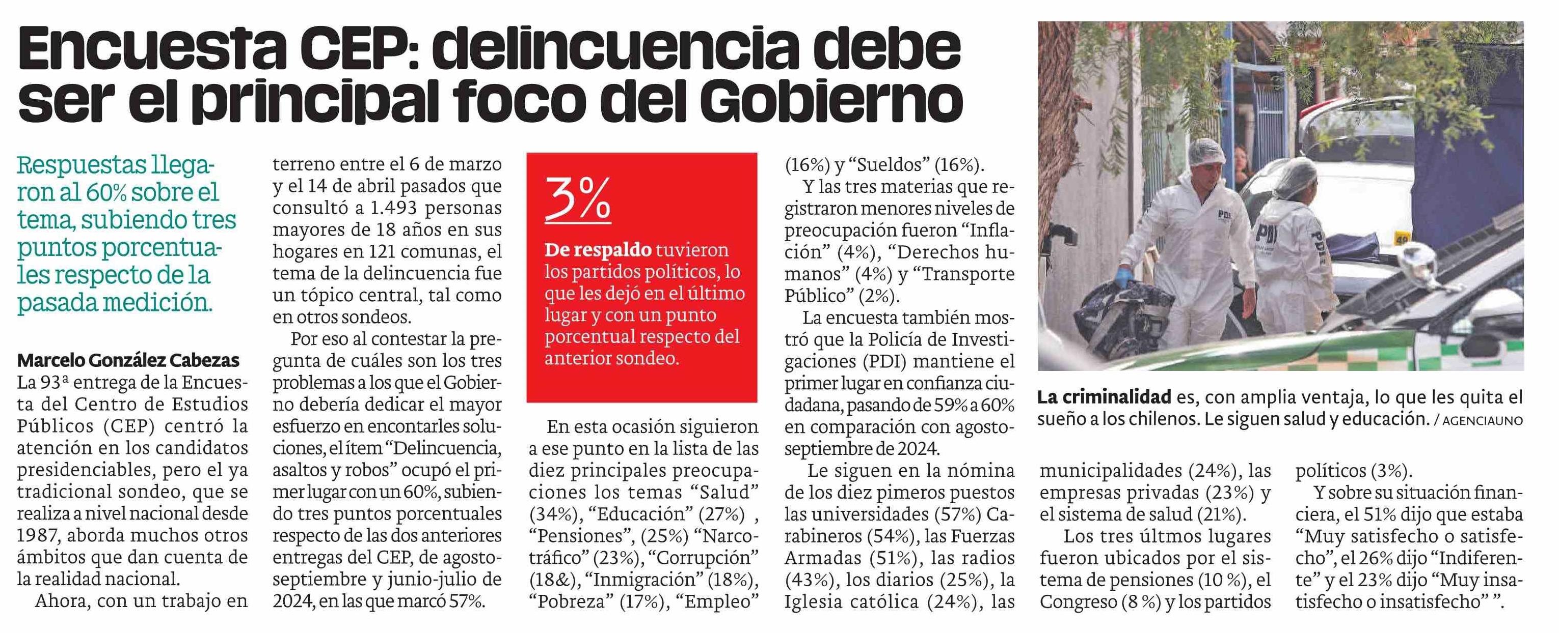 Encuesta CEP: delincuencia debe ser el principal foco del Gobierno 08-05-2025 Publimetro |