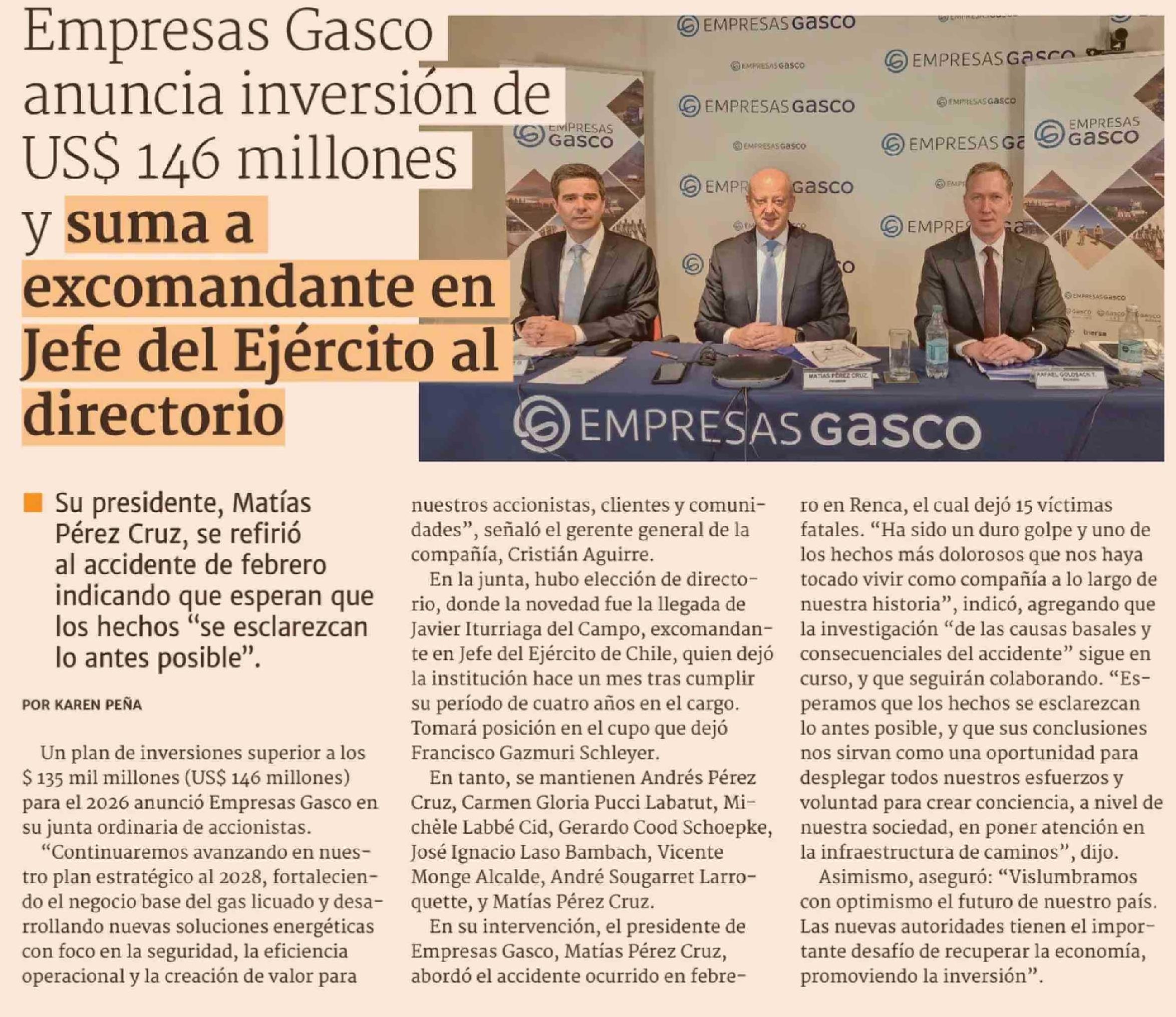 Título: Empresas Gasco anuncia inversión de US$ 146 millones y suma a excomandante en Jefe del Ejército al directorio