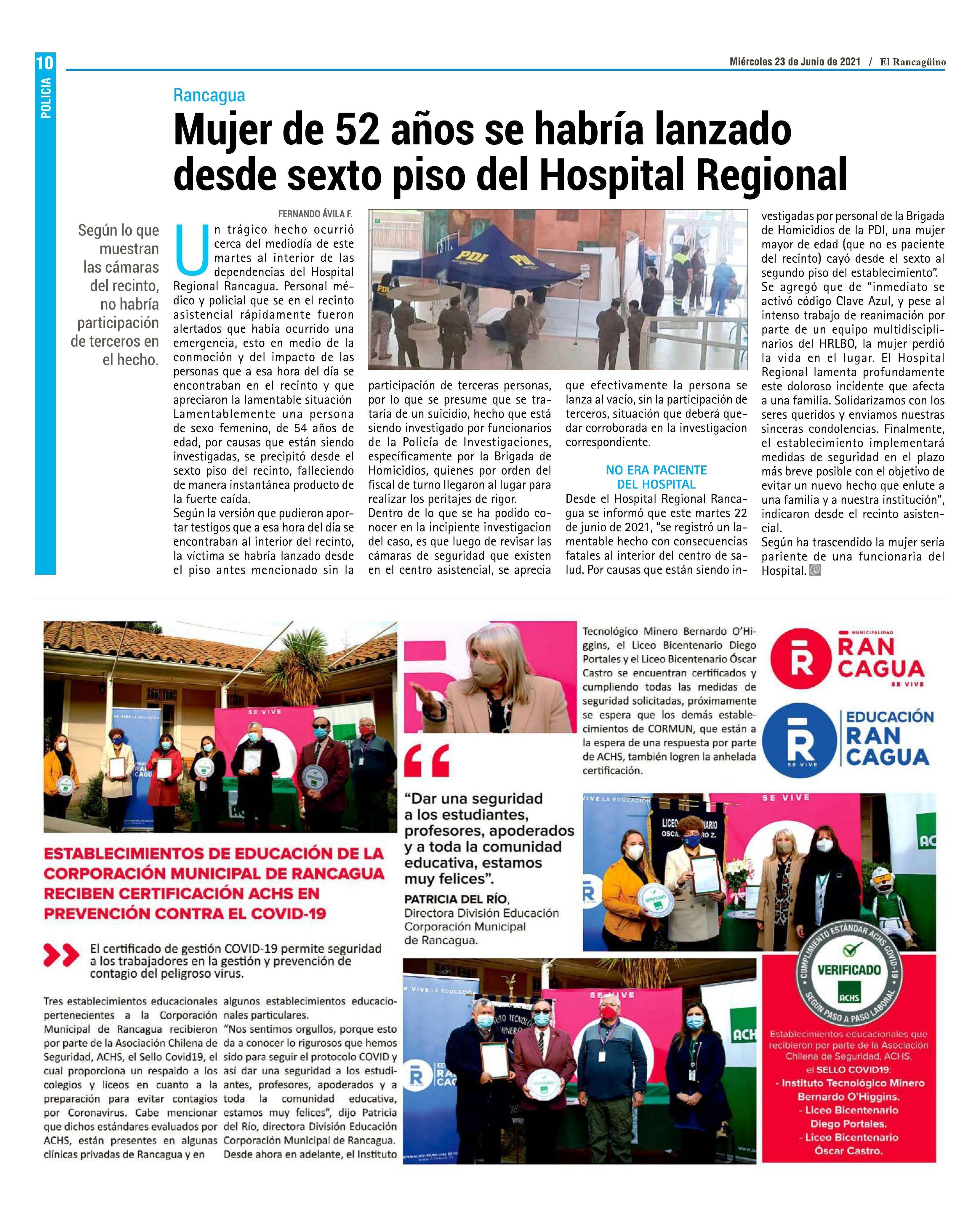 Rancagua Mujer de 52 años se habría lanzado desde sexto piso del Hospital Regional 23-06-2021 El Rancagüino |