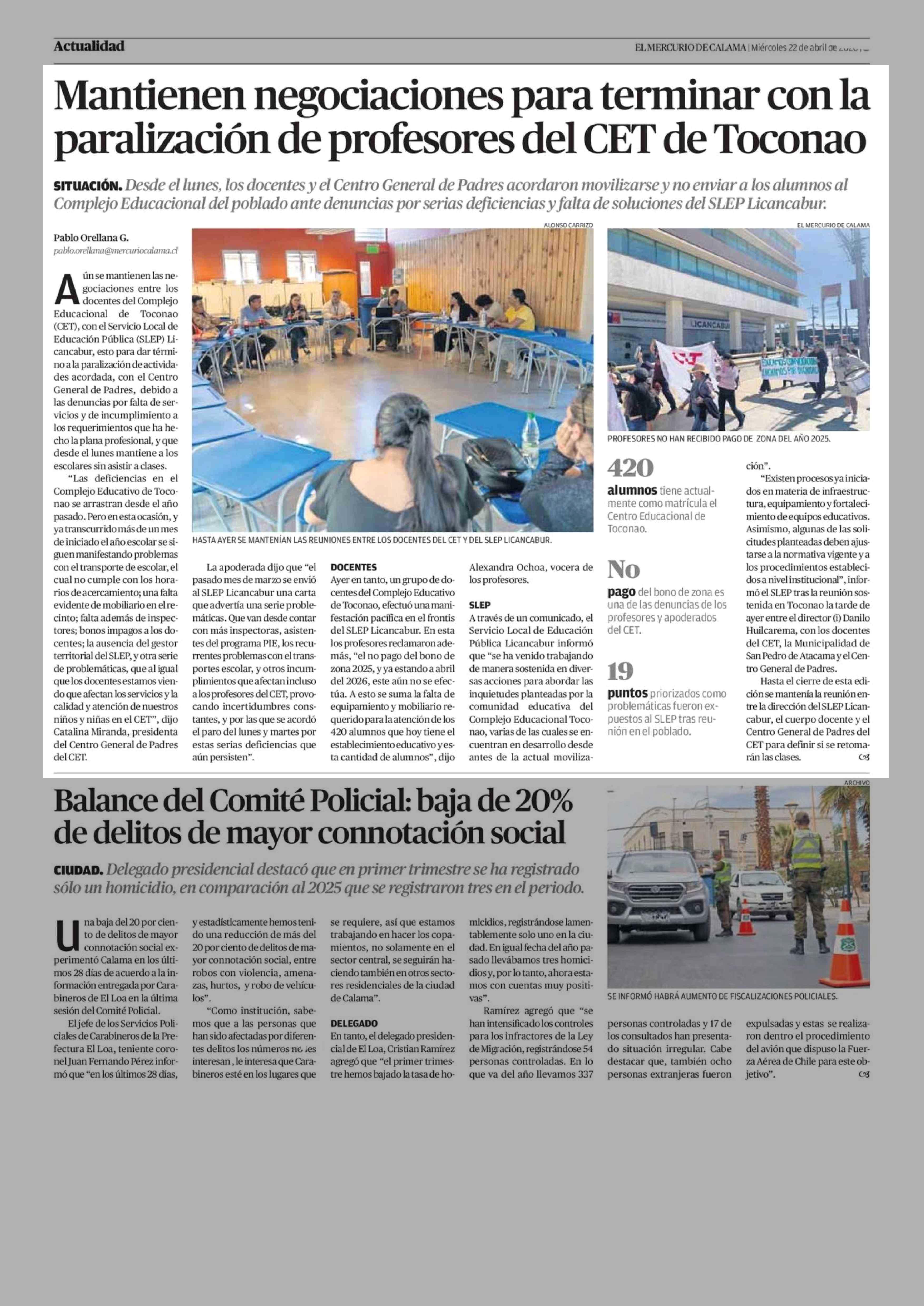 Mantienen negociaciones para terminar con la paralización de profesores del CET de Toconao 22-04-2026 El Mercurio de Calama |