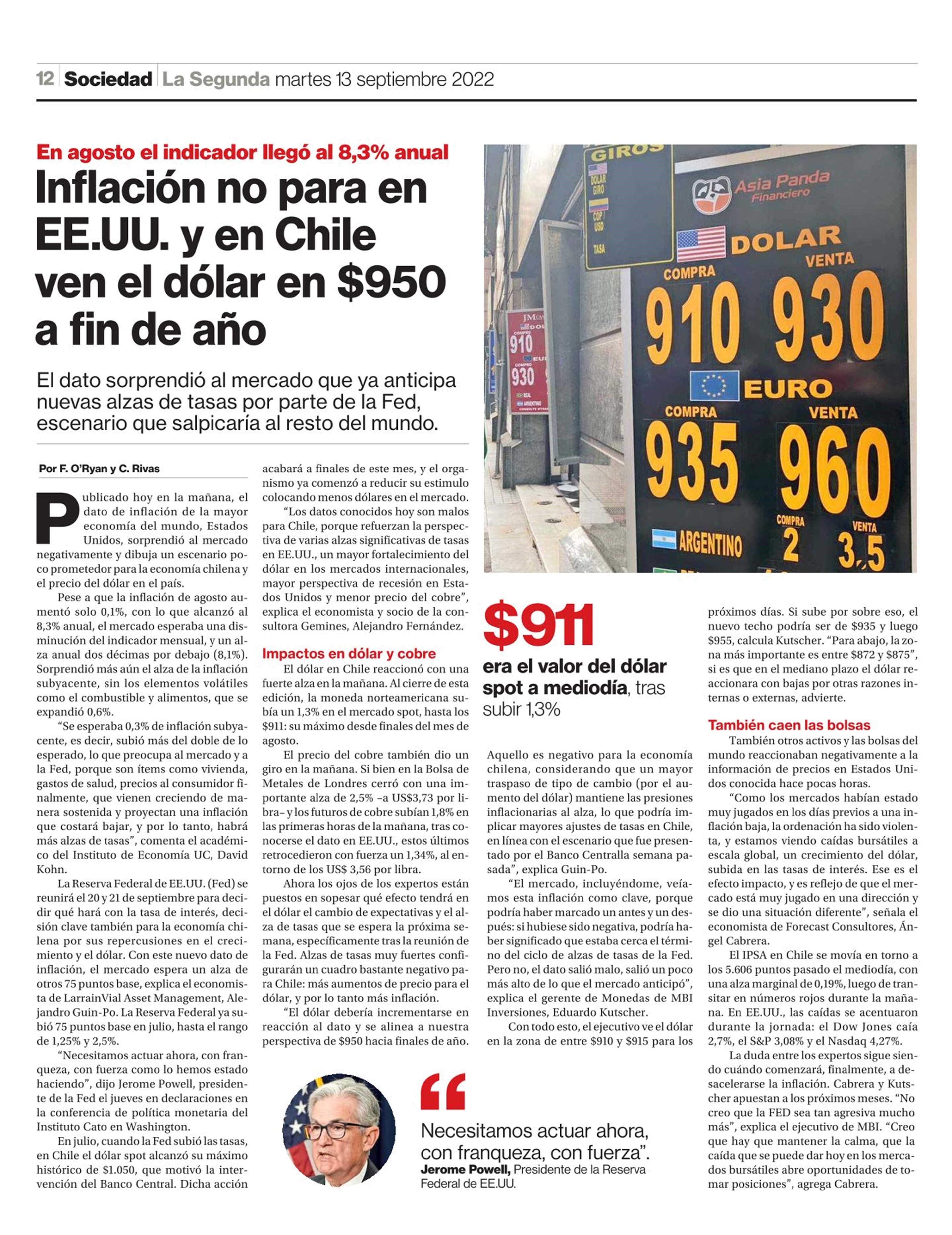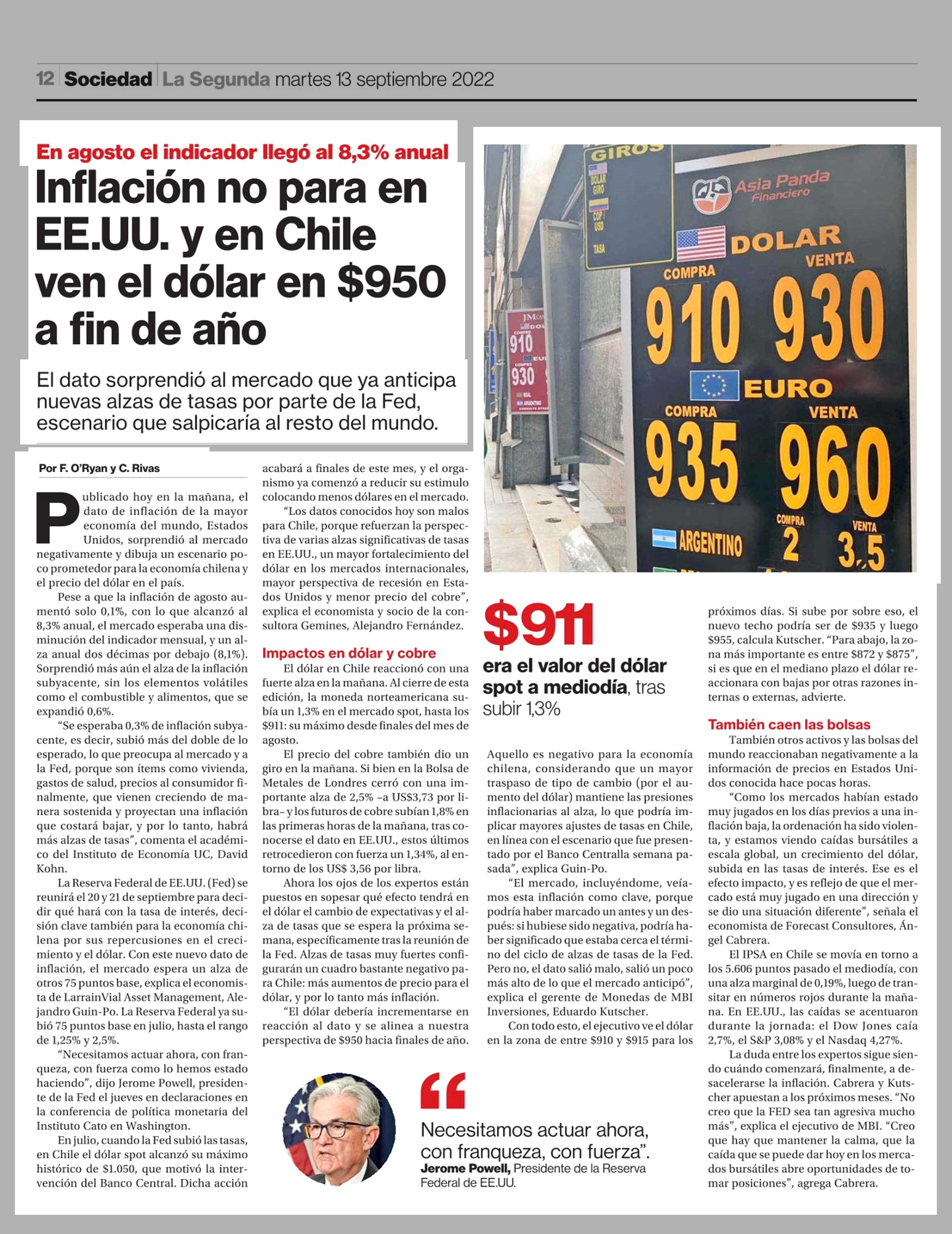 Inflación no para en EE.UU. Y en Chile ven el dólar en $950 a fin de año 13-09-2022 La Segunda |