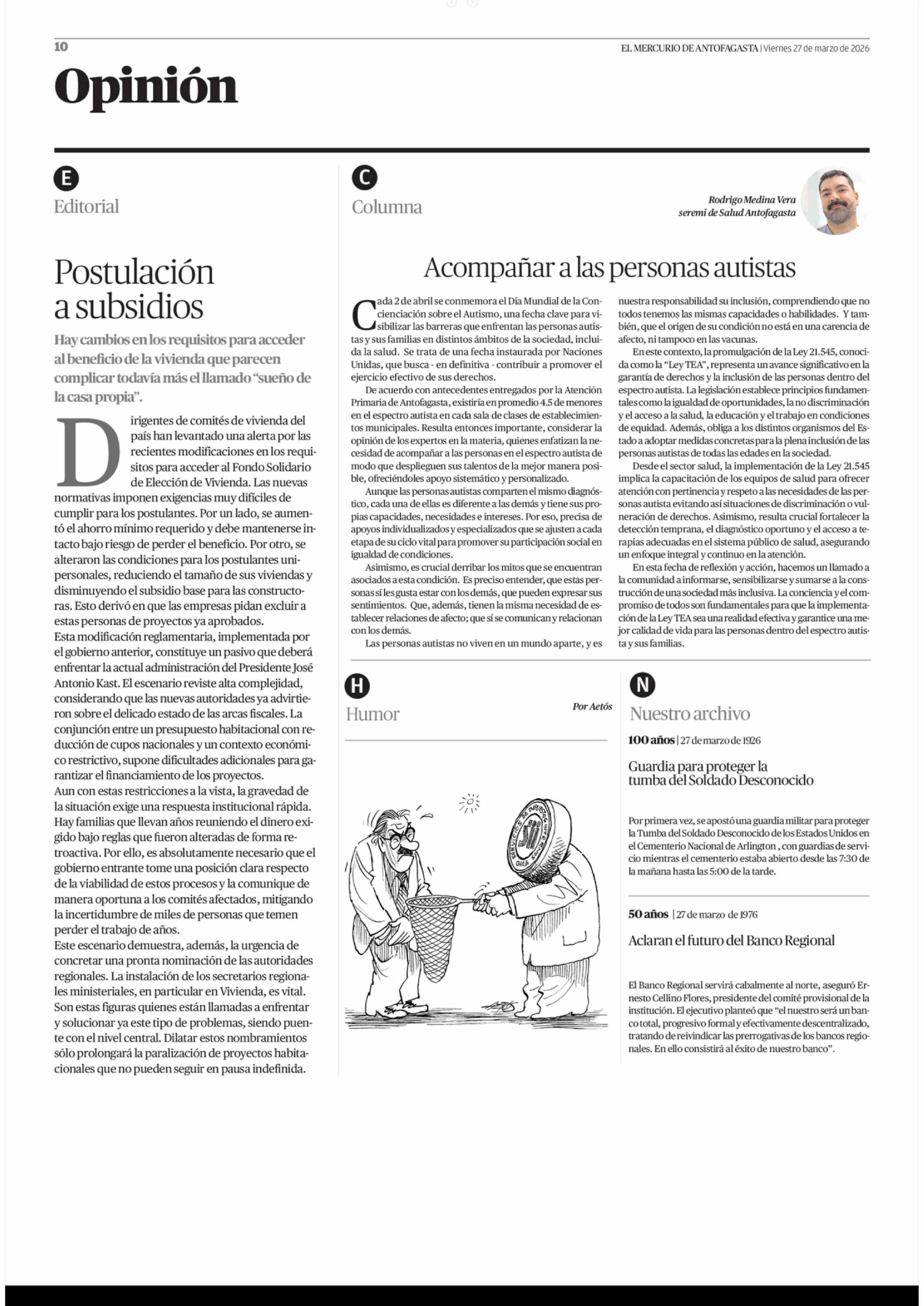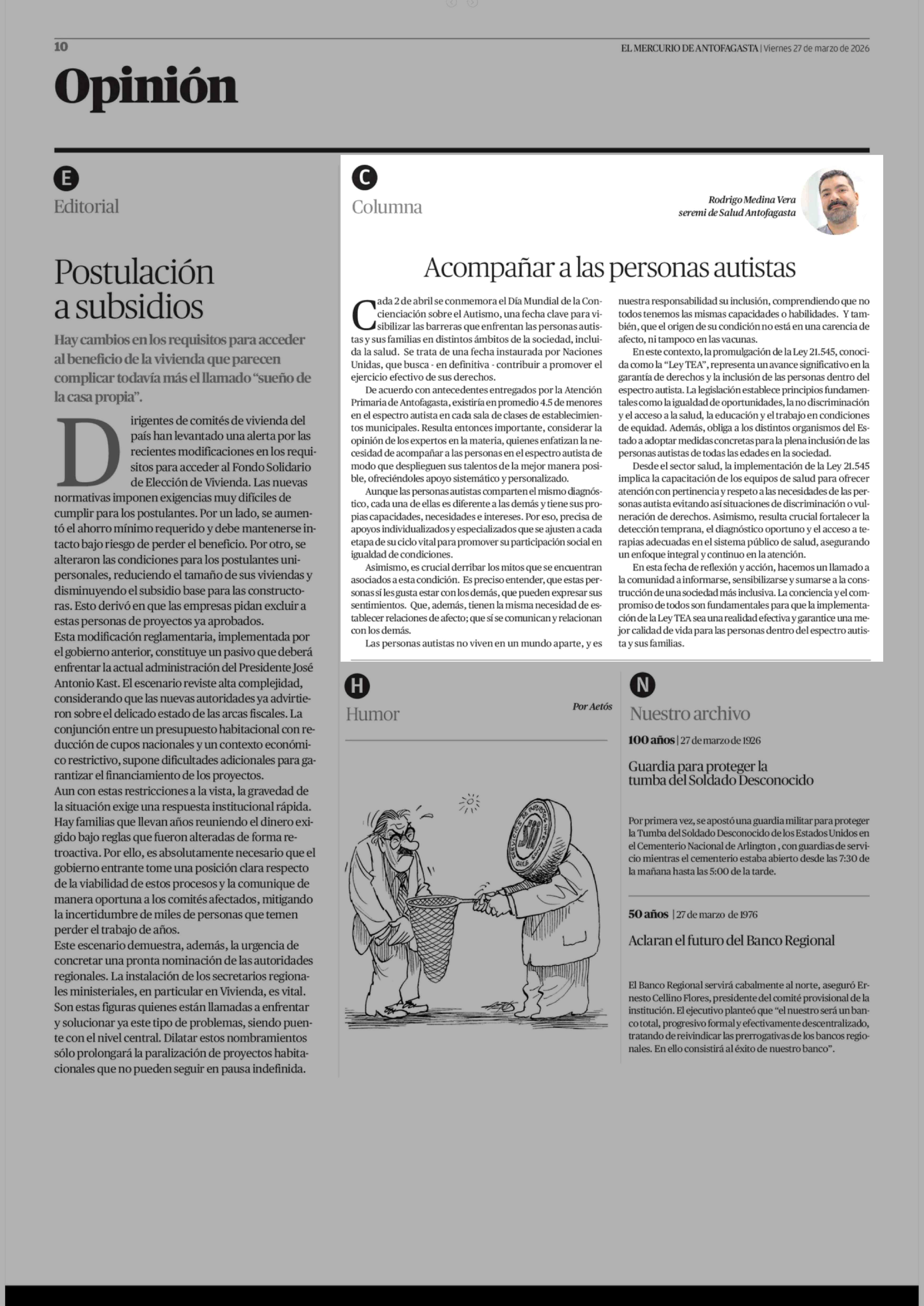 Columnas de Opinión: Acompañar a las personas autistas 27-03-2026 El Mercurio de Antofagasta |