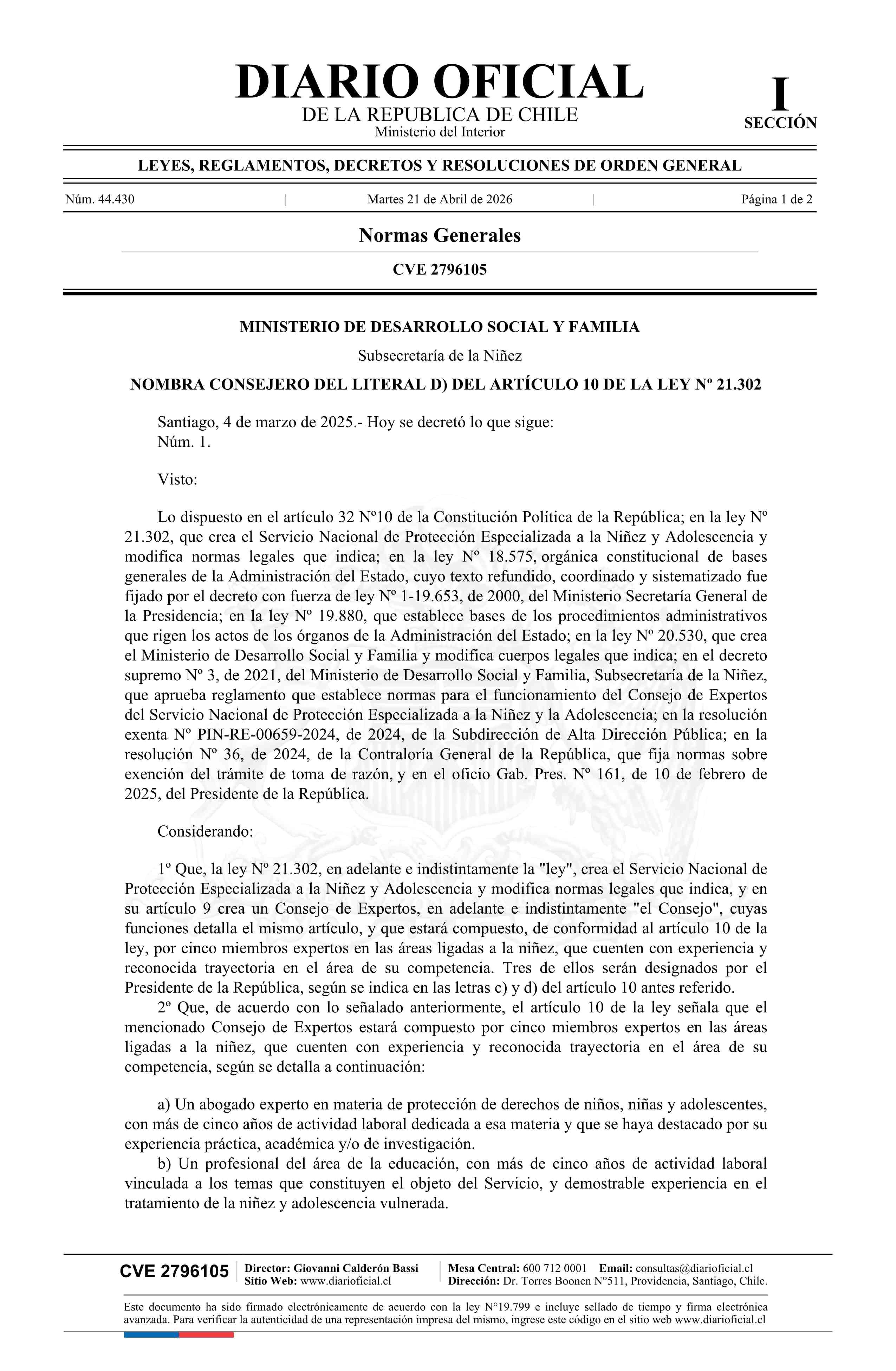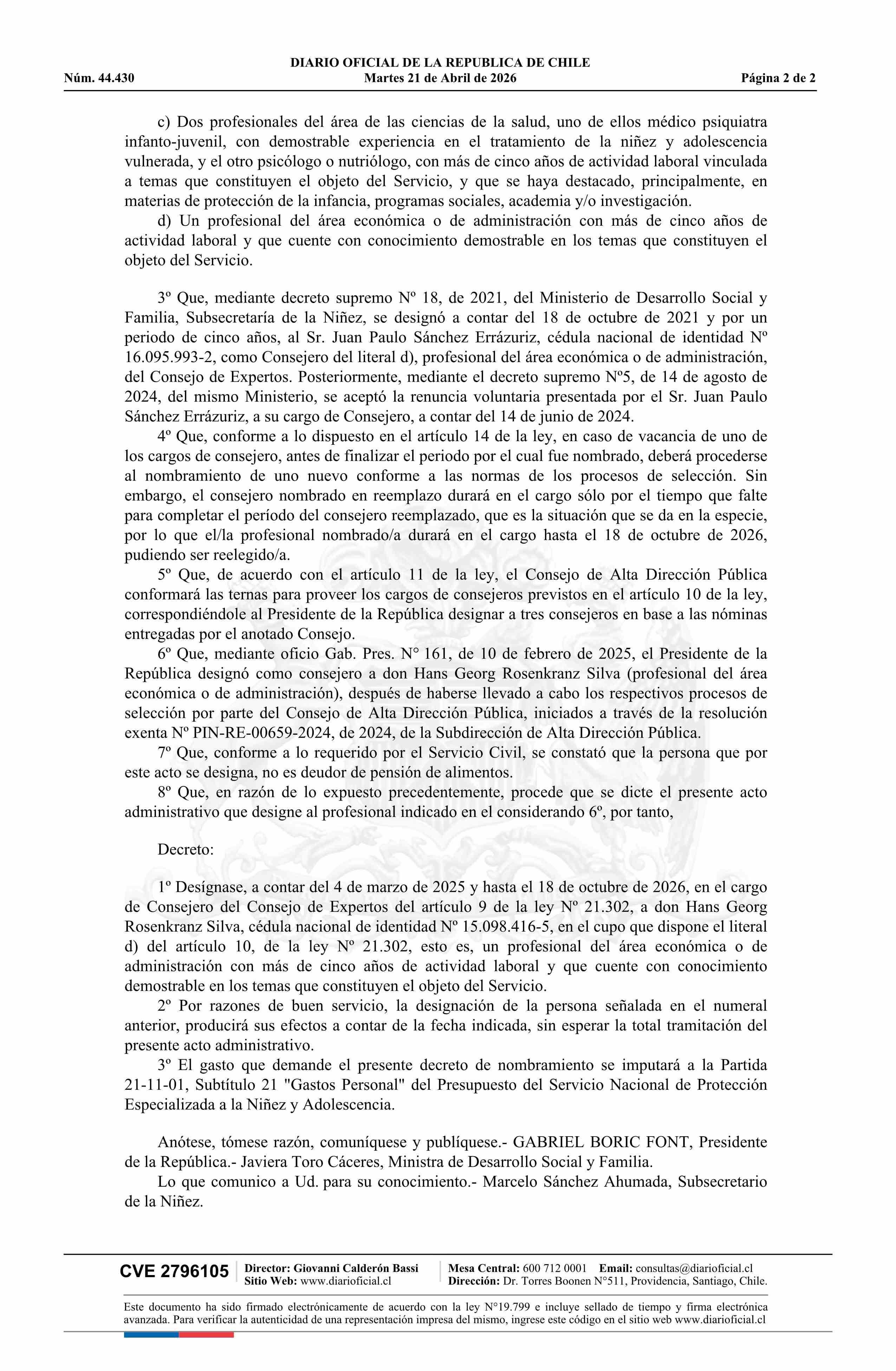 Decreto número 1, de 2025.- Nombra a don Hans Georg Rosenkranz Silva en el cargo de Consejero del Consejo de Expertos 21-04-2026 Diario Oficial Edición Electrónica |