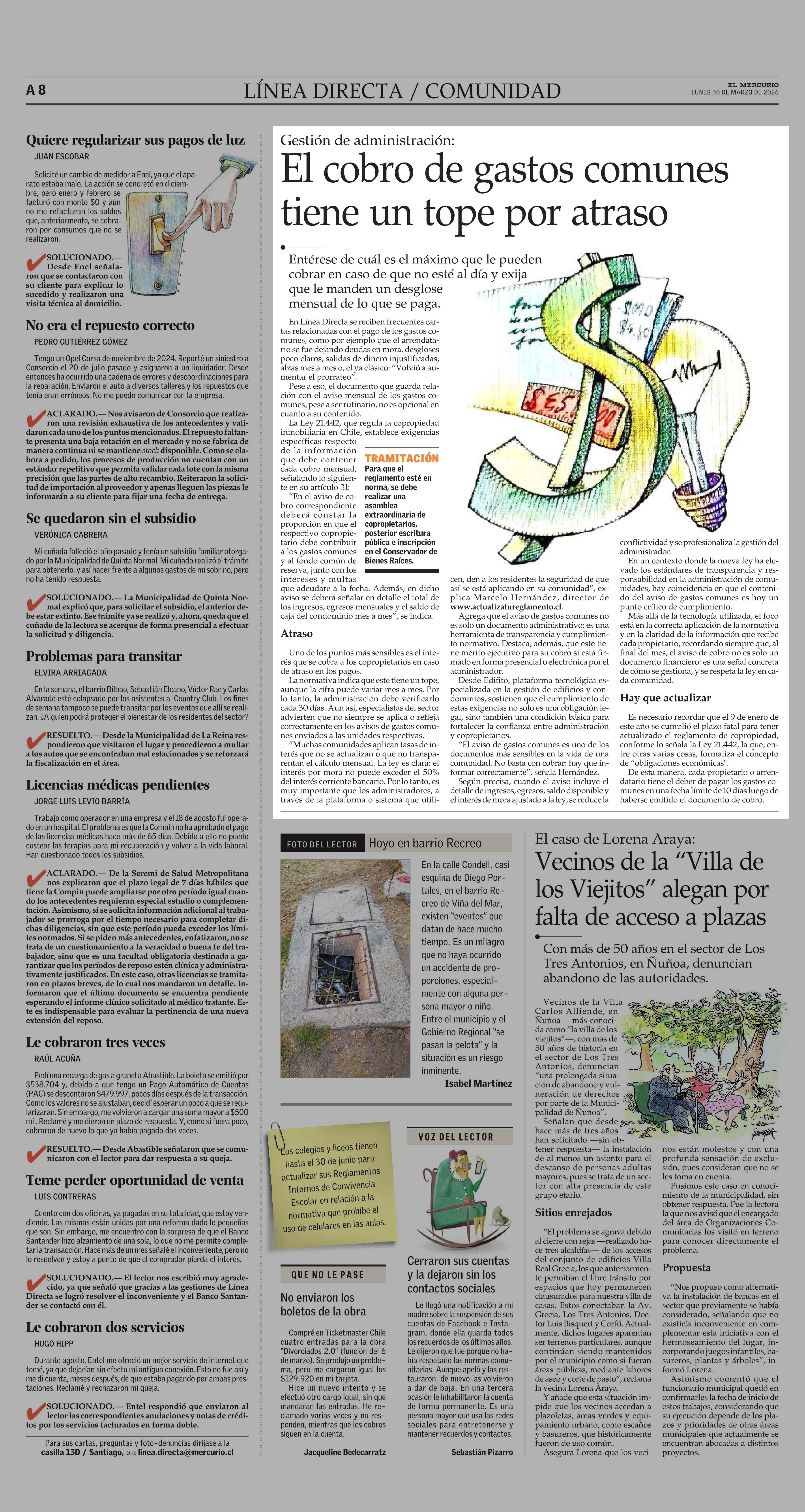 El cobro de gastos comunes tiene un tope por atraso 30-03-2026 El Mercurio |
