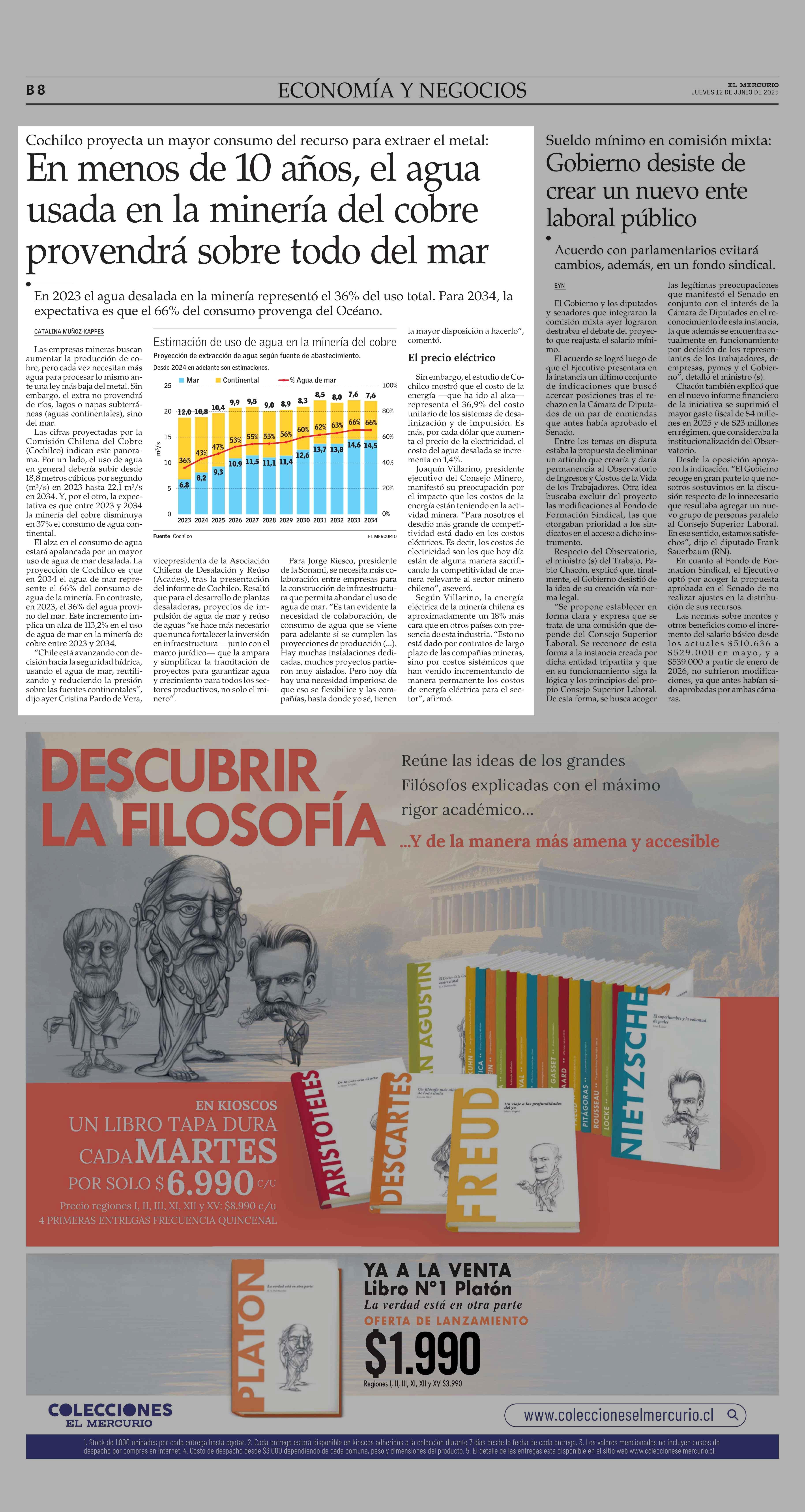En menos de 10 años, el agua usada en la minería del cobre provendrá sobre todo del mar 12-06-2025 El Mercurio |