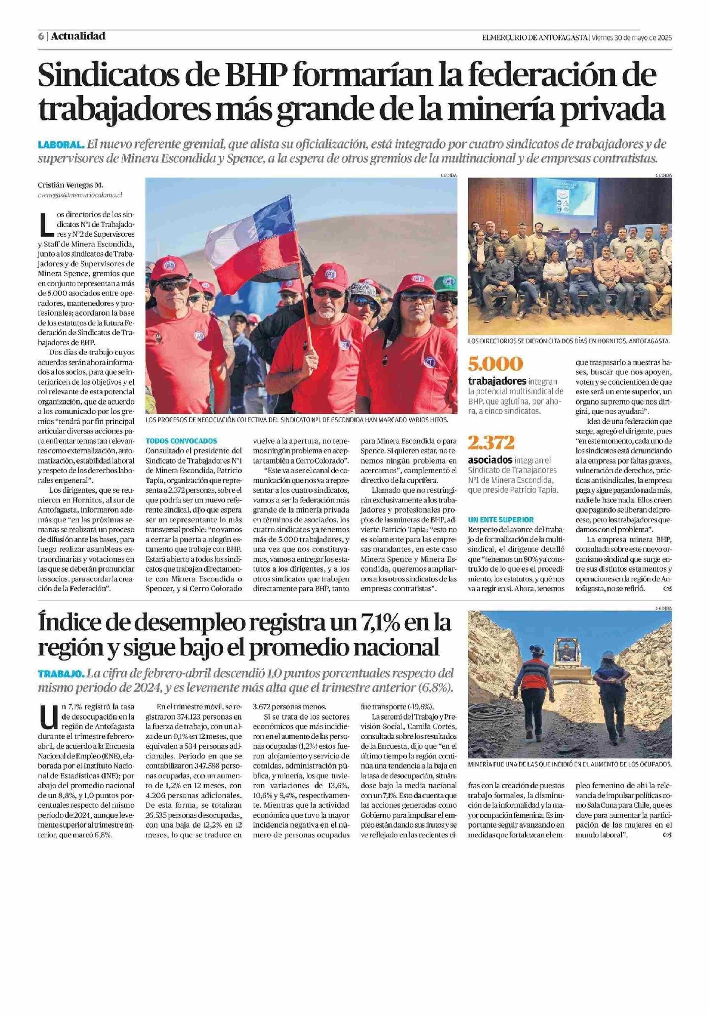 Sindicatos de BHP formarían la federación de trabajadores más grande de la minería privada 30-05-2025 El Mercurio de Antofagasta |