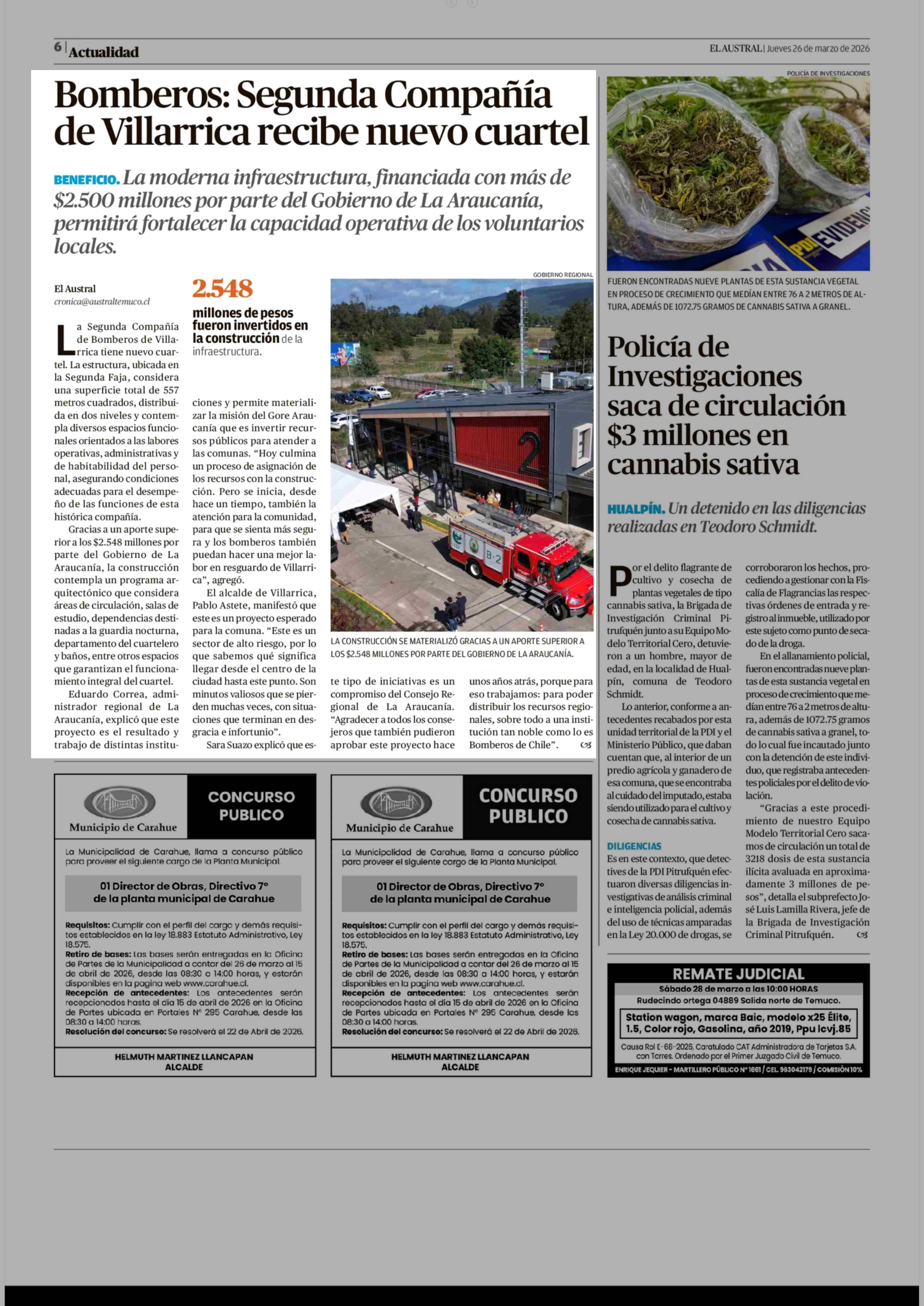 Bomberos: Segunda Compañía de Villarrica recibe nuevo cuartel 26-03-2026 El Austral de la Araucanía |