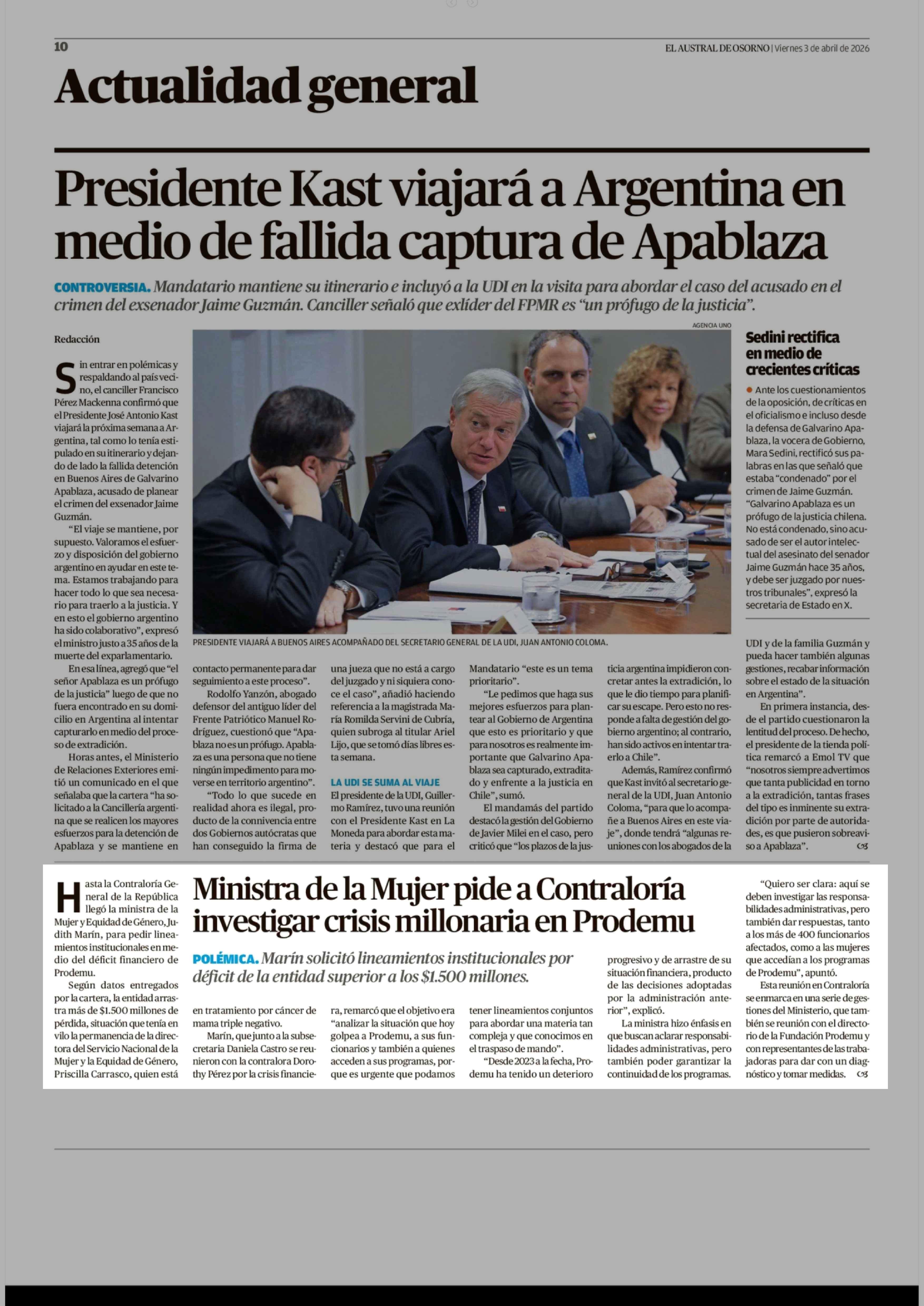 Ministra de la Mujer pide a Contraloría investigar crisis millonaria en Prodemu 03-04-2026 El Austral de Osorno |
