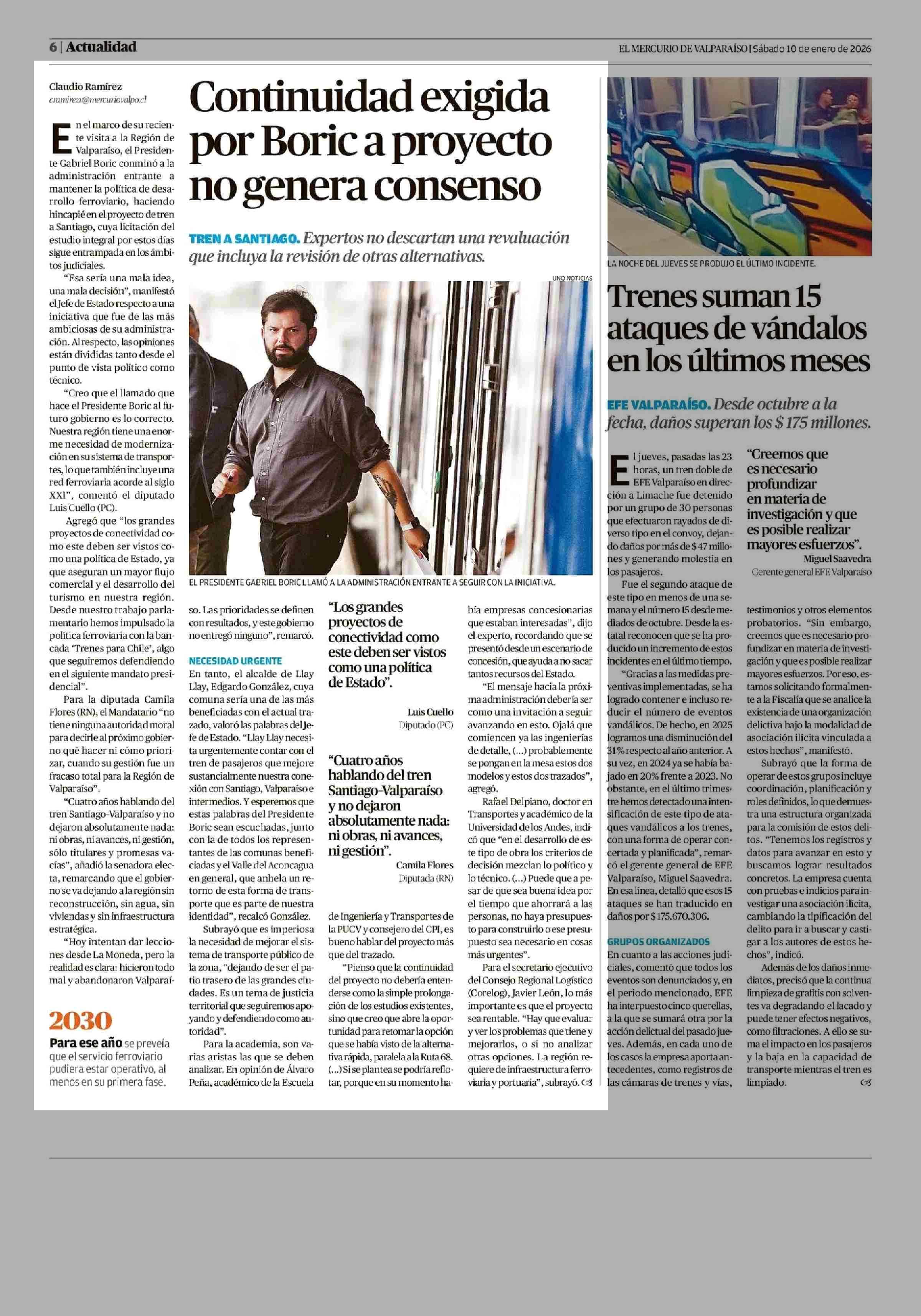 Continuidad exigida por Boric a proyecto no genera consenso 10-01-2026 El Mercurio de Valparaíso |