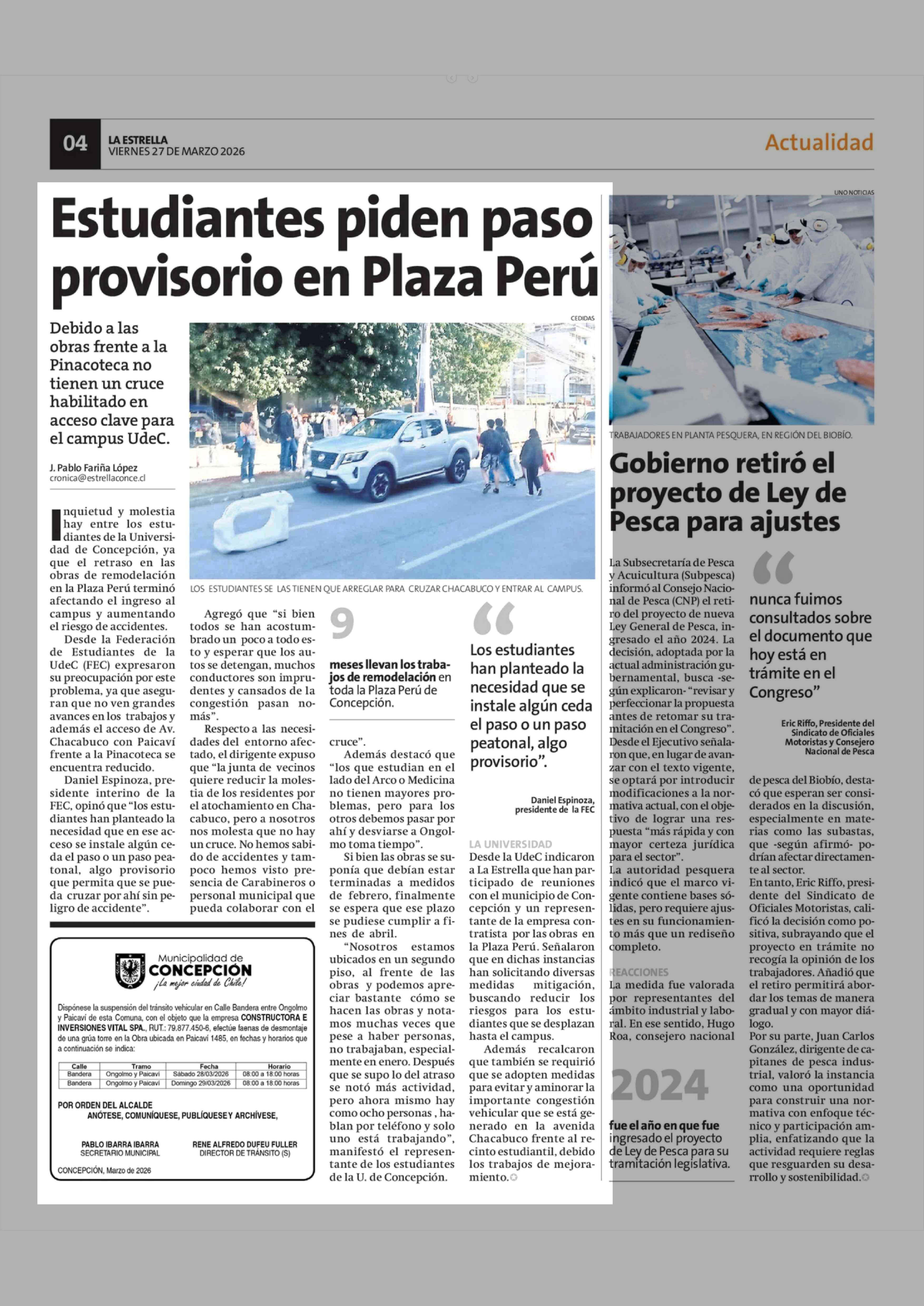 Estudiantes piden paso provisorio en Plaza Perú 27-03-2026 La Estrella de Concepción |